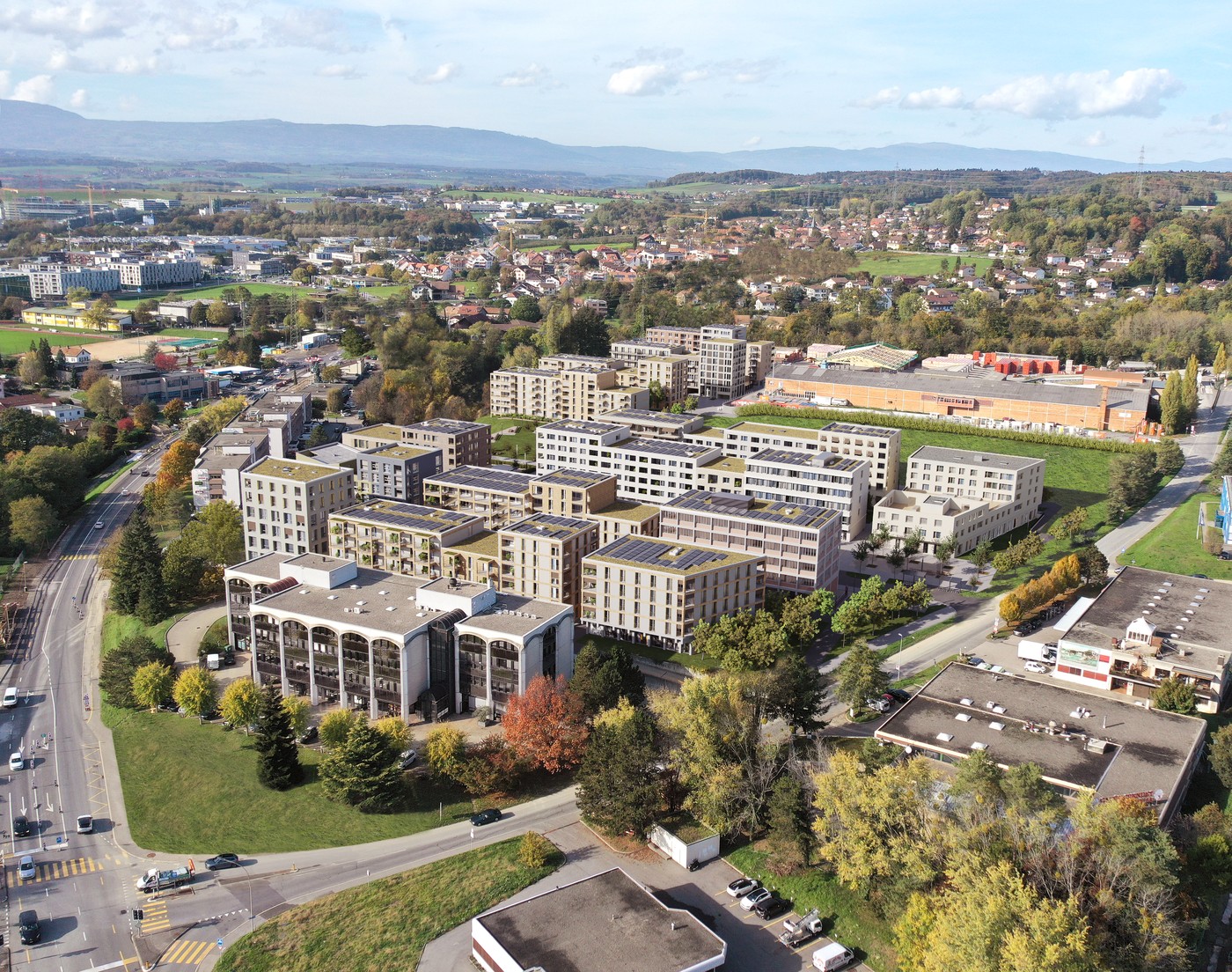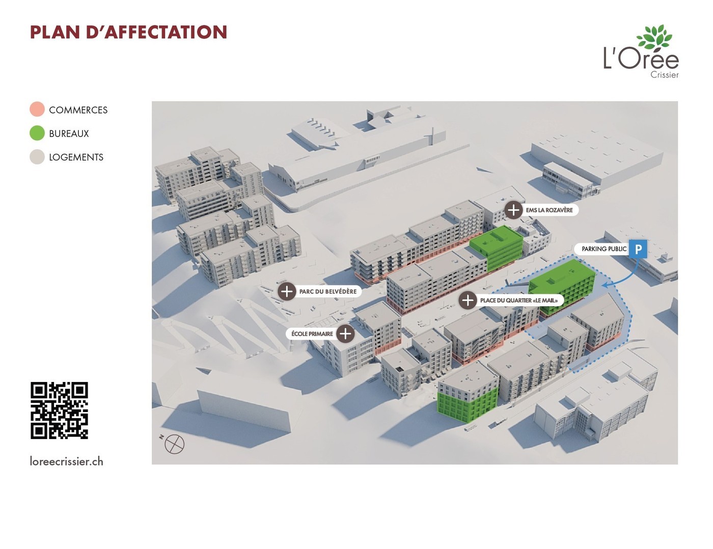 • Déjà sur place : école primaire, garderie, EMS, médecin généraliste, physio, coiffeur, barbier, kiosk, épicerie, pizzeria, esthétique, massage, etc.