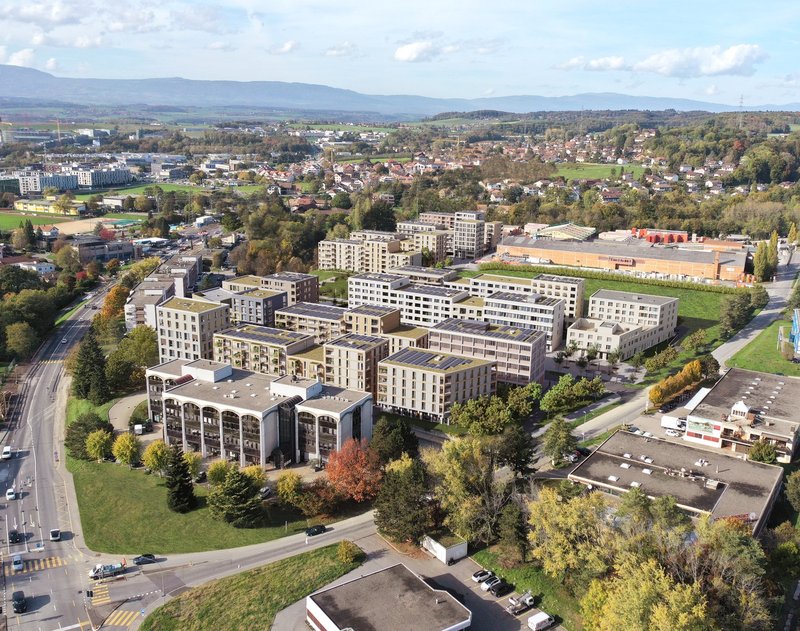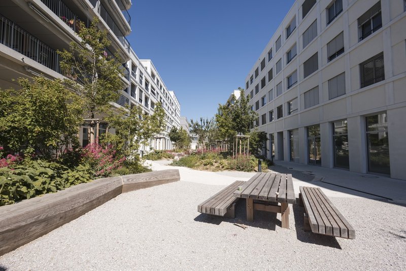 • Quartier moderne et équipé avec panneaux photovoltaïques, bornes de recharge pour véhicule électrique, emplacement Mobility Car Sharing et station PubliBike.
