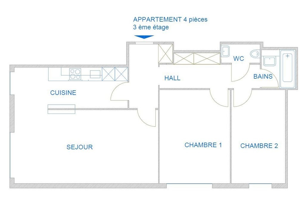 Hall d'entrée, une cuisine moderne entièrement équipée et aménagée, un séjour/salle à manger baigné de lumière, deux chambres à coucher, une salle de bain avec baignoire et un wc séparé.