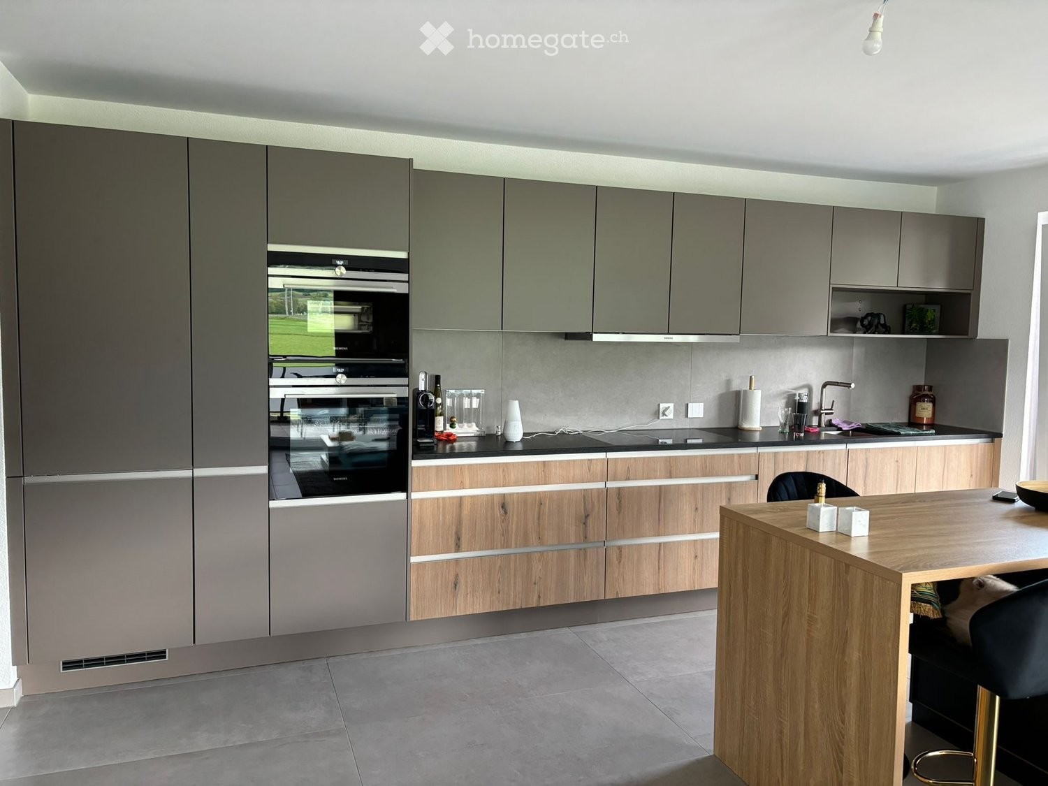 Grand séjour lumineux avec espace de vie ouvert Quatre chambres spacieuses avec grandes fenêtres et carrelage effet bois Cuisine moderne ouverte avec armoires en bois, plan de travail en pierre naturelle noire, four encastré, steamer, lave-vaisselle et hotte Deux salles de bain avec baignoire et douche, deux WC, double vasque et colonne de lavage privative Matériaux de qualité et architecture moderne offrant un cadre de vie agréable Terrasse