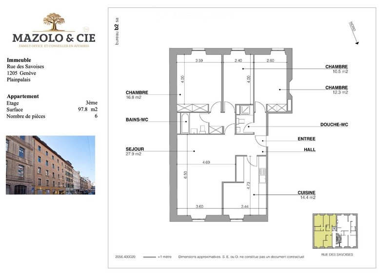 Situé au 3e étage d une petite copropriété très calme, ce magnifique appartement de 5.5 pièces offre un cadre de vie privilégié en plein centre de Genève. Une adresse recherchée, idéale pour une famille ou un couple souhaitant de l espace, du confort et de la tranquillité.