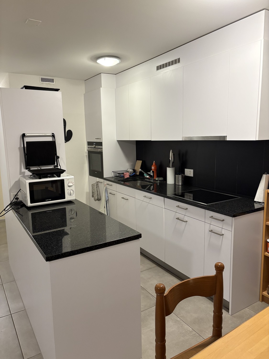 L’appartement de 4.5 pièces comprend une grande cuisine avec îlot très bien équipée (four, lave-vaisselle, micro-ondes), un salon avec télévision, un balcon avec barbeque, une salle de bains avec douche et colonne de lavage-séchage dédiée et une toilette séparée.