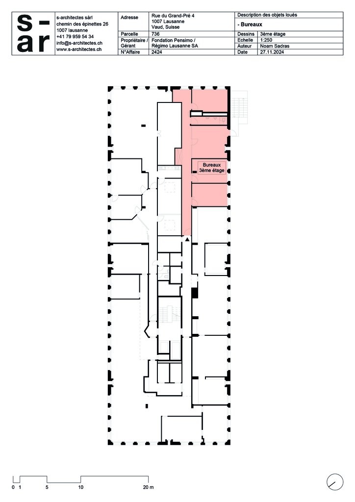 La disposition actuelle est la suivante : 4 bureaux fermés et un coin WC, le tout est réparti sur un même niveau au 3ème étage de l'immeuble.