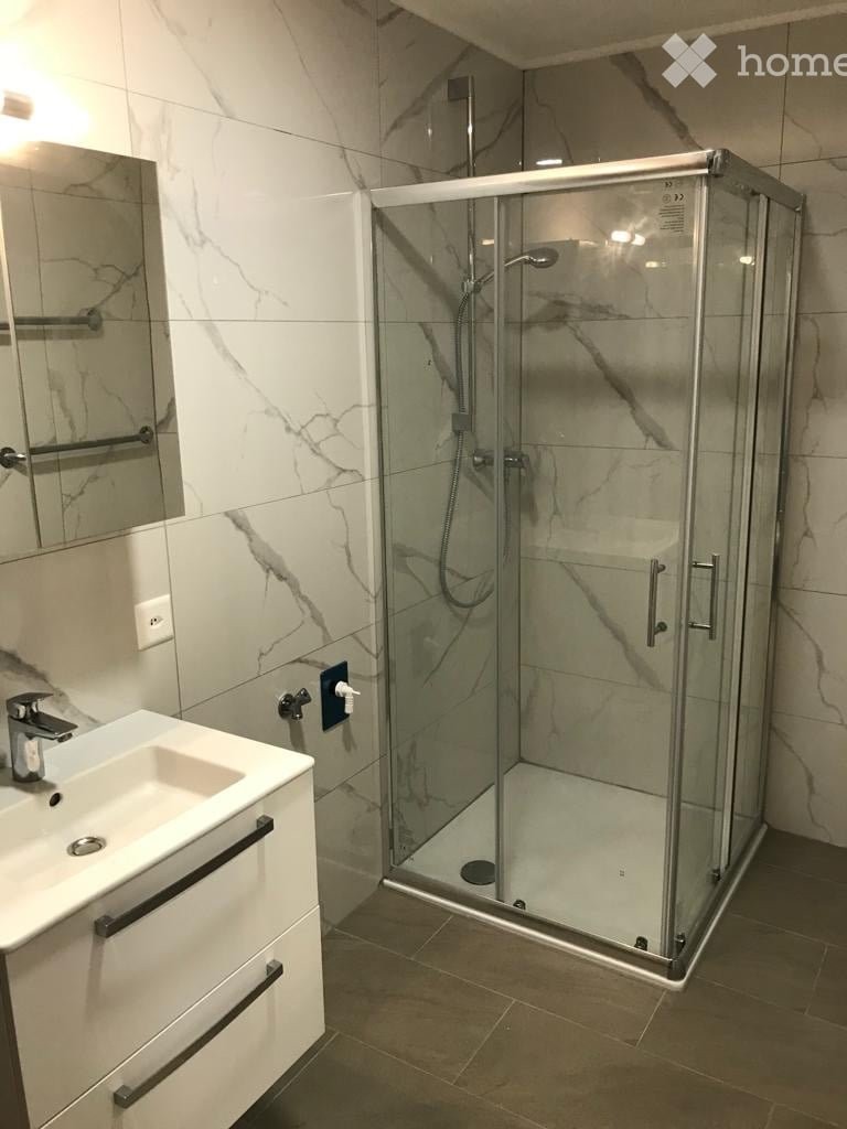 Séjour lumineux, salle de bains avec cabin de douche et machine lave-linge.