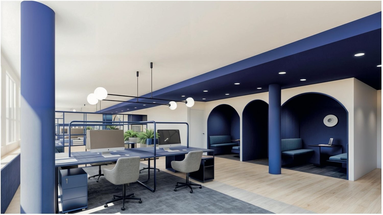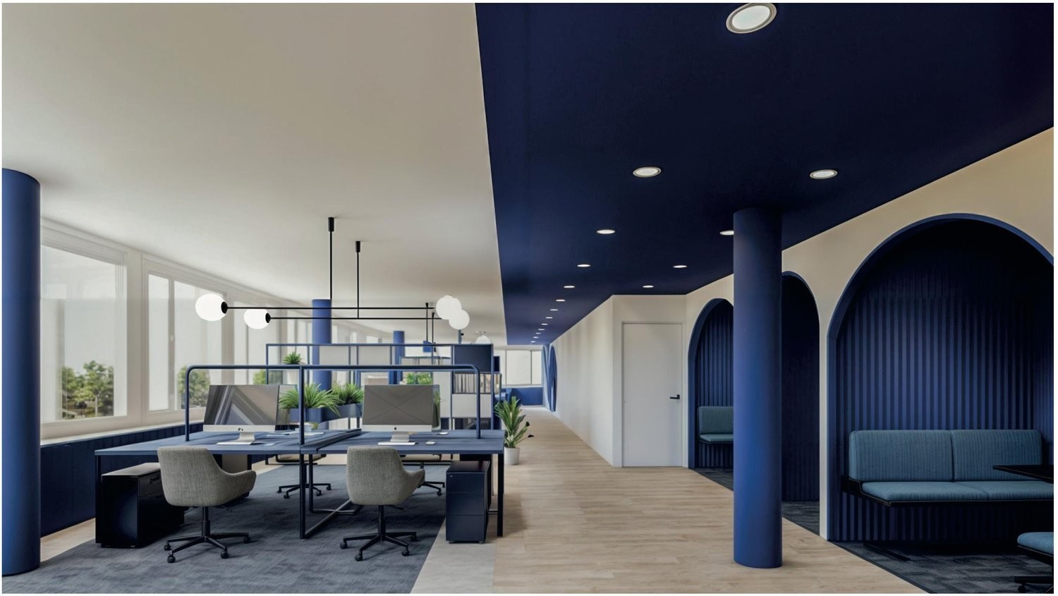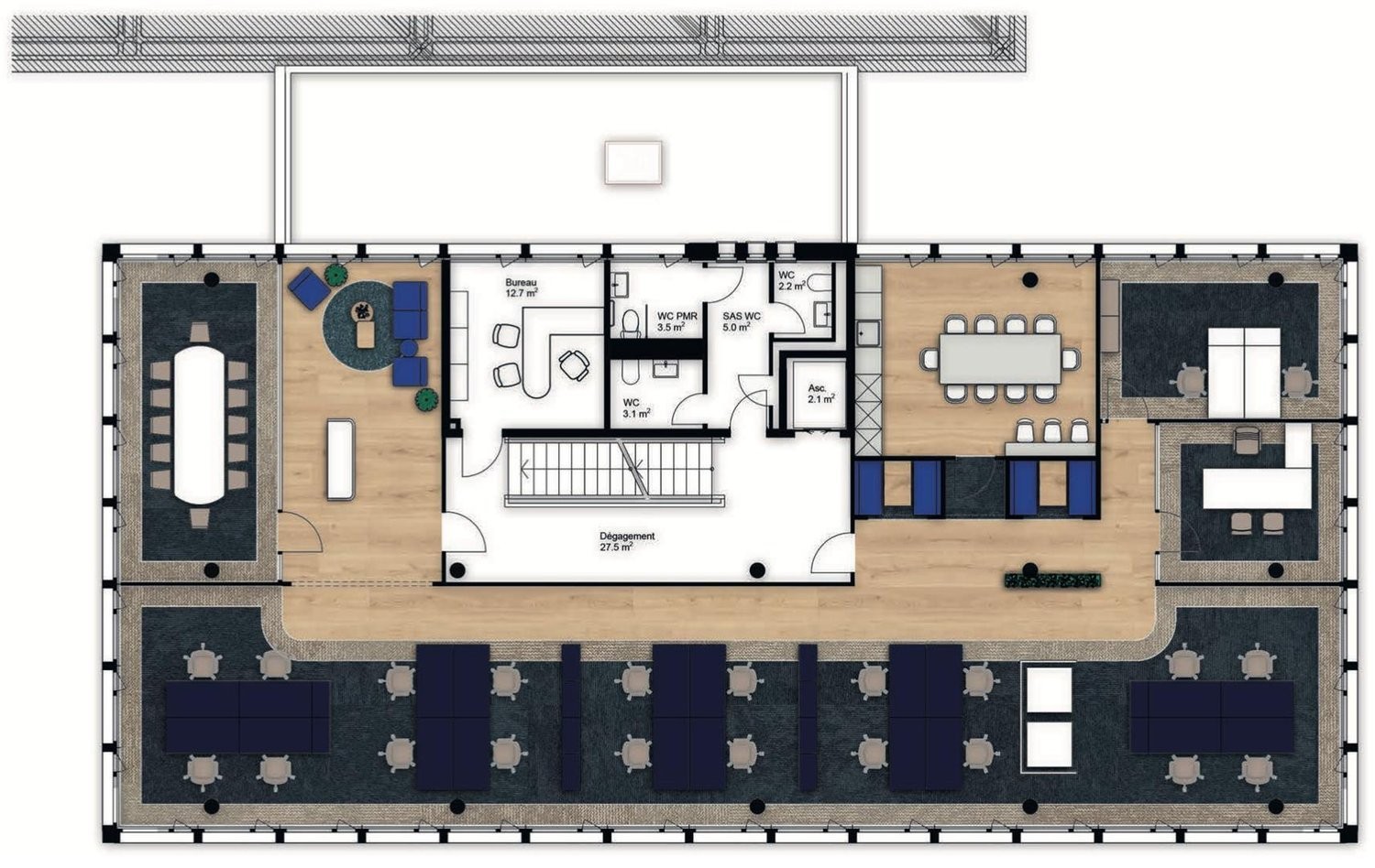 Les visuels 3D ne sont que des exemples d'aménagements. Les surfaces seront livrées brutes en Décembre 2026, équipées uniquement de ventilo-convecteurs réversibles (rafraîchissement l'été et chauffage l'hiver). L'aménagement peut néanmoins être fait sur mesure à la demande du preneur.