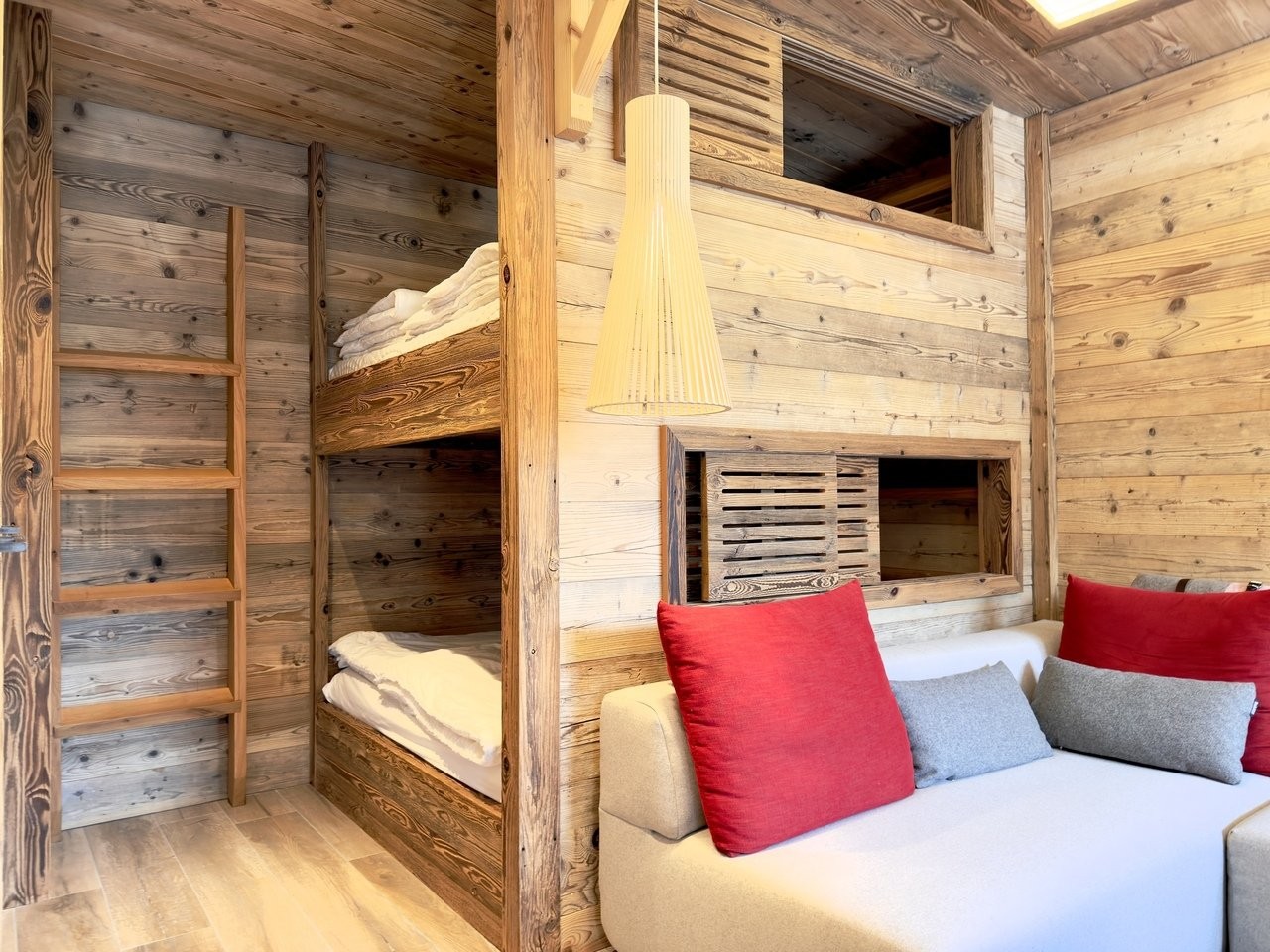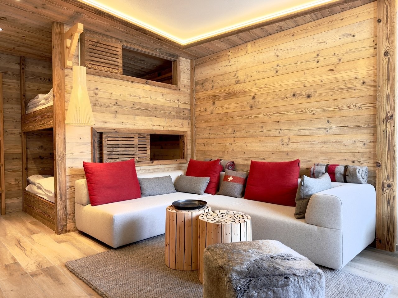 Un séjour avec canapé et deux lits doubles superposés;