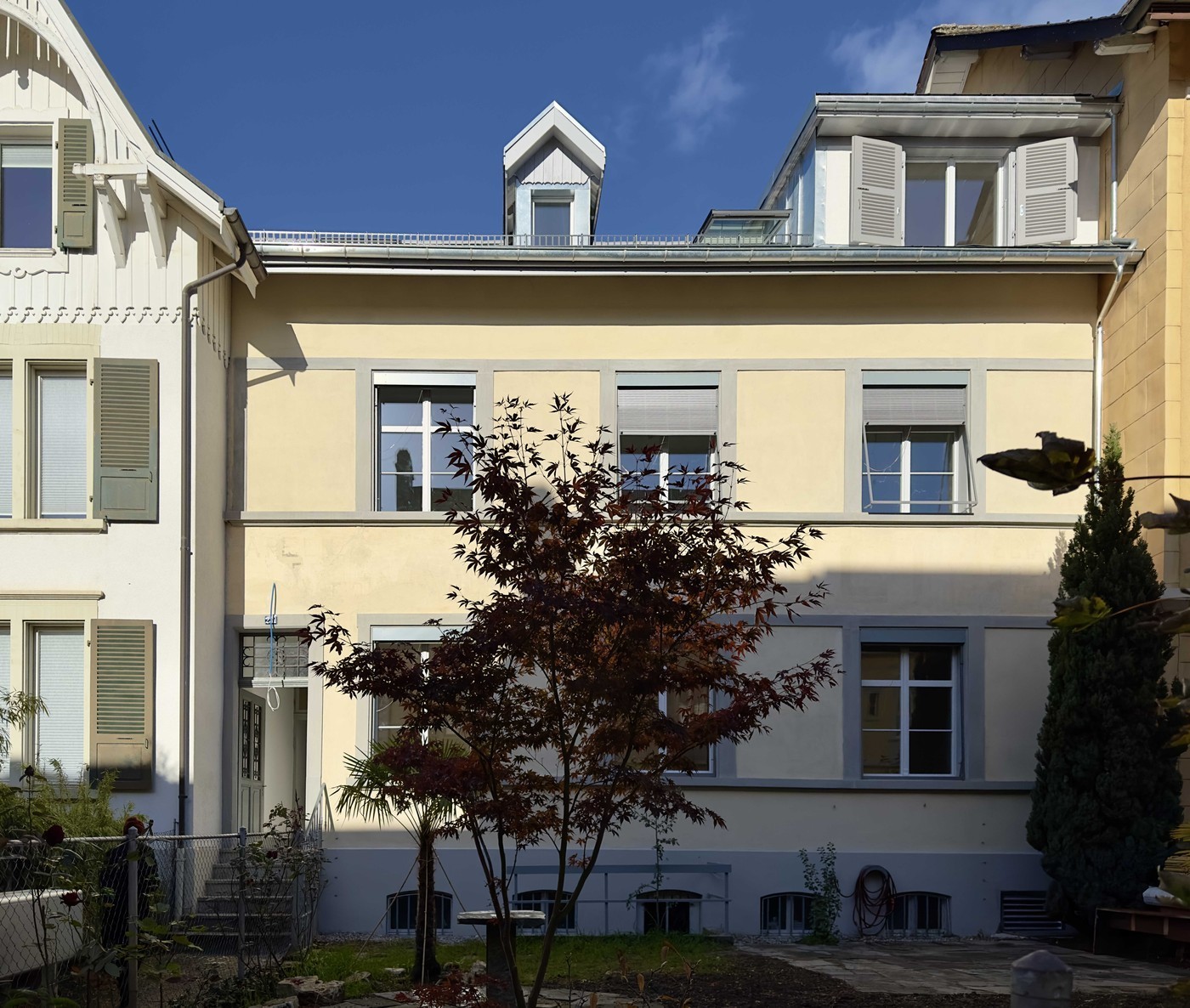 Entrée rue du Stand 23a, allée dallée, Jardin commun de 100m2, table granit, terrasse de 20m2, escaliers accès direct caves et buanderie et abri vélo couvert