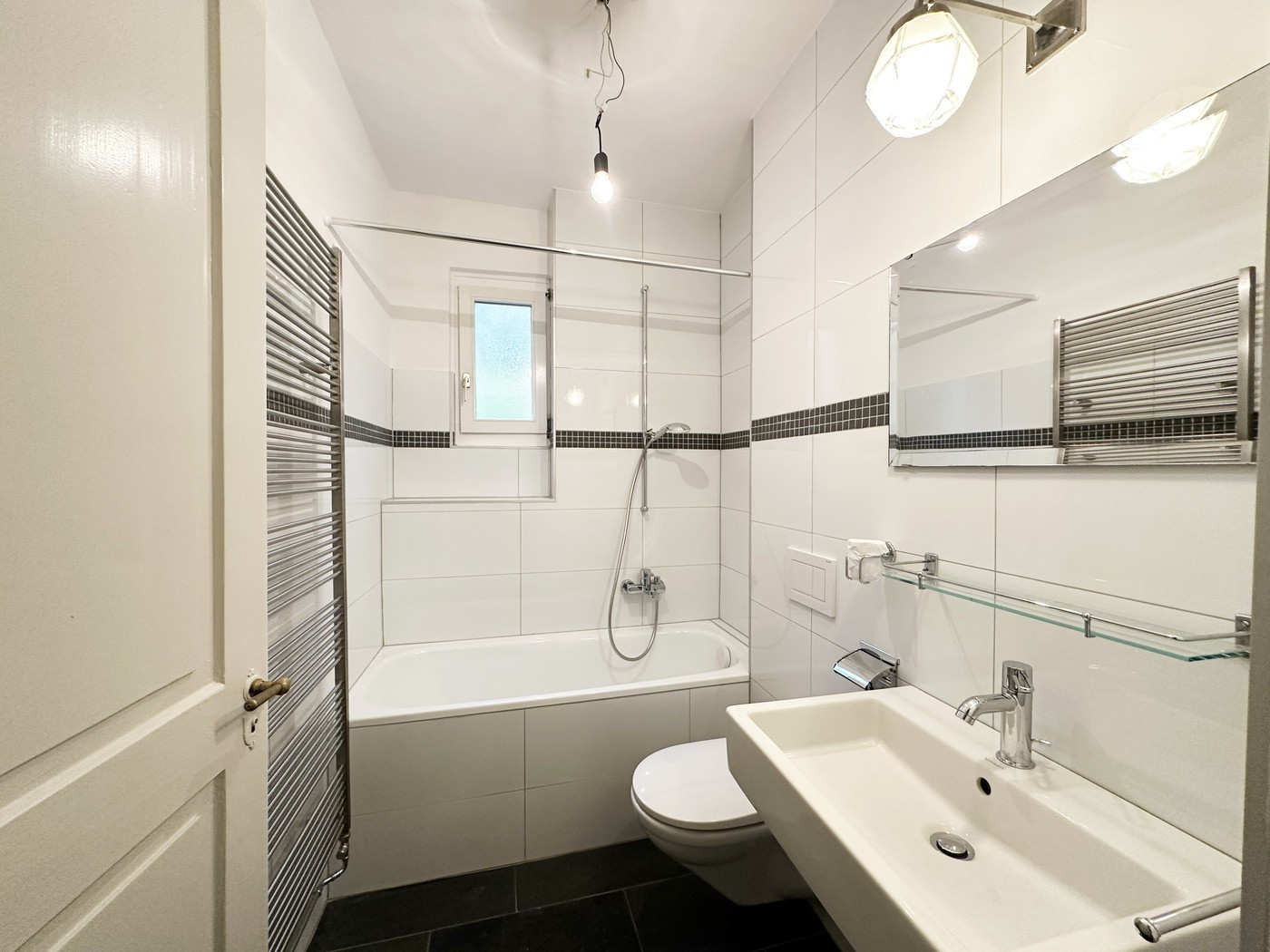 Salle de bain/WC : 4,2m2, hauteur sous plafond 300cm,baignoire, radiateur porte-linge, fenêtre basculante, sol ardoise, lampe et miroir installés