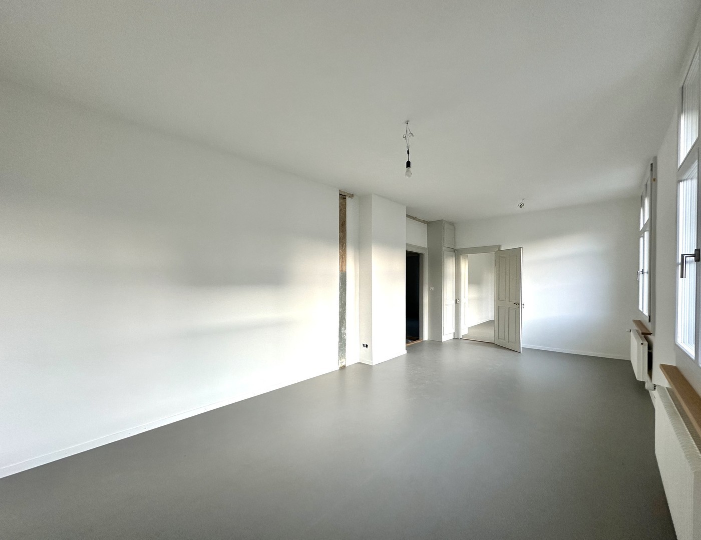 Séjour-living spacieux 27m2, hauteur sous plafond 300cm, armoire intégrée, 2 grandes fenêtres 140x200cm triple vitrage, sol linoléum isolé phoniquement