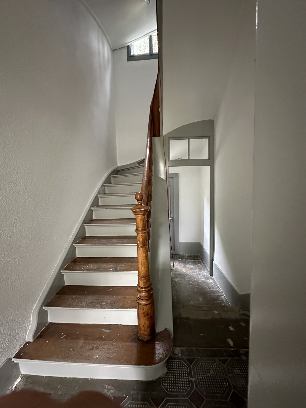 Cage escaliers en chêne origine, dalles ciment, vue sur entrée secondaire Nord : 2 places de parc voiture privée, abri couvert pour vélo, descente cave et buanderie