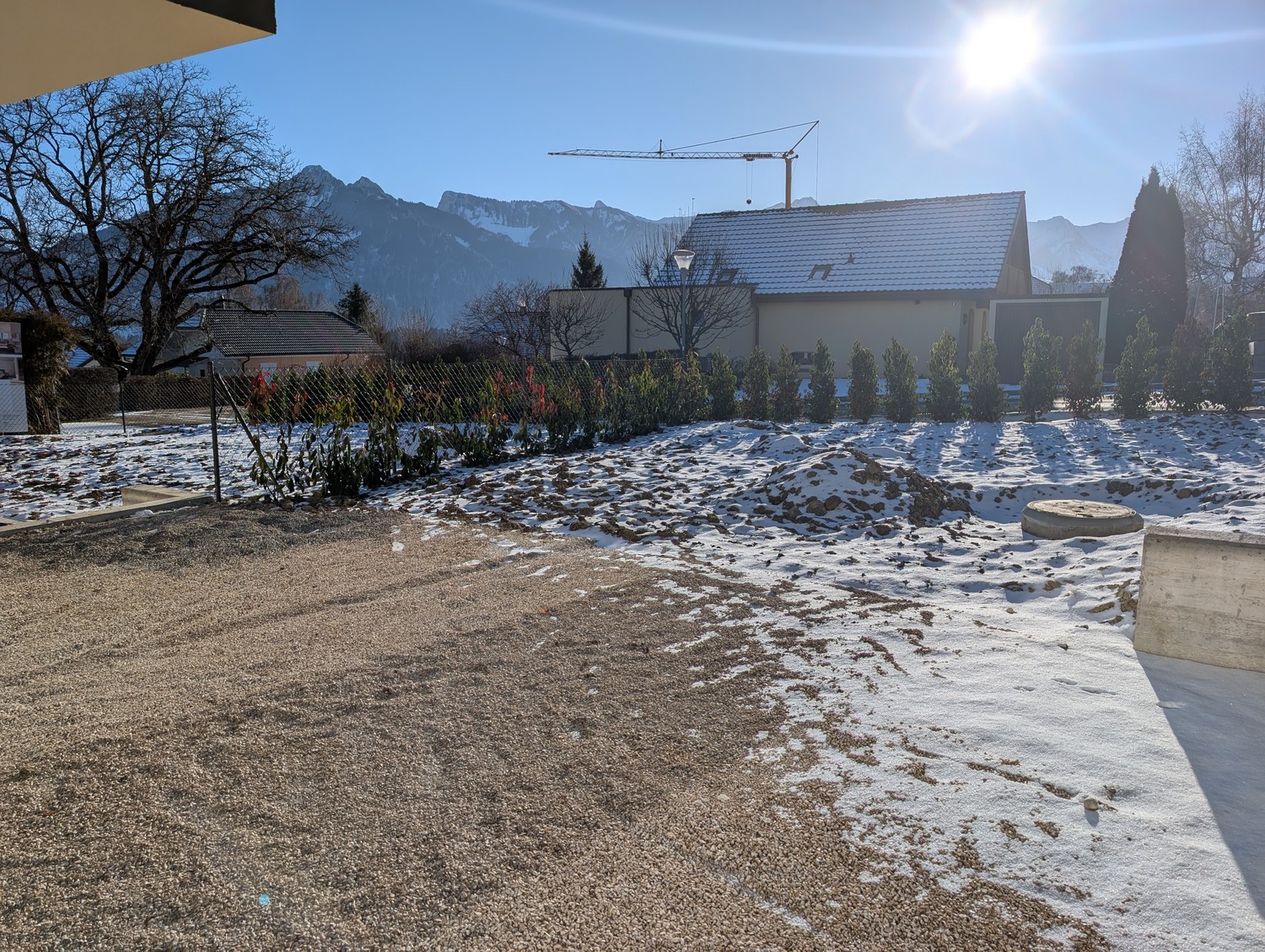 Jardin privatif de 102 m² et sa terrasse de 28 m², vue sur les montagnes et le Moléson.