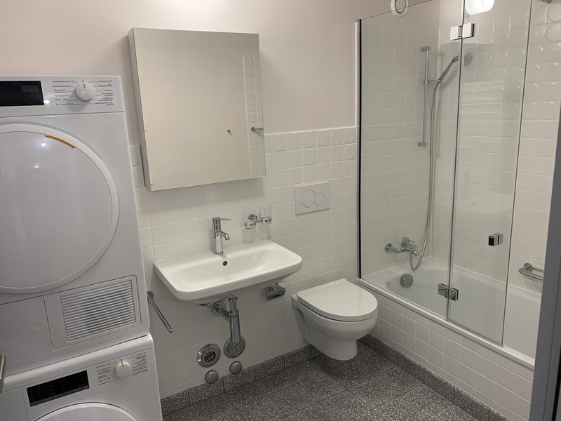 - 1 salle de bains dotée d'une machine à laver et d'un sèche-linge