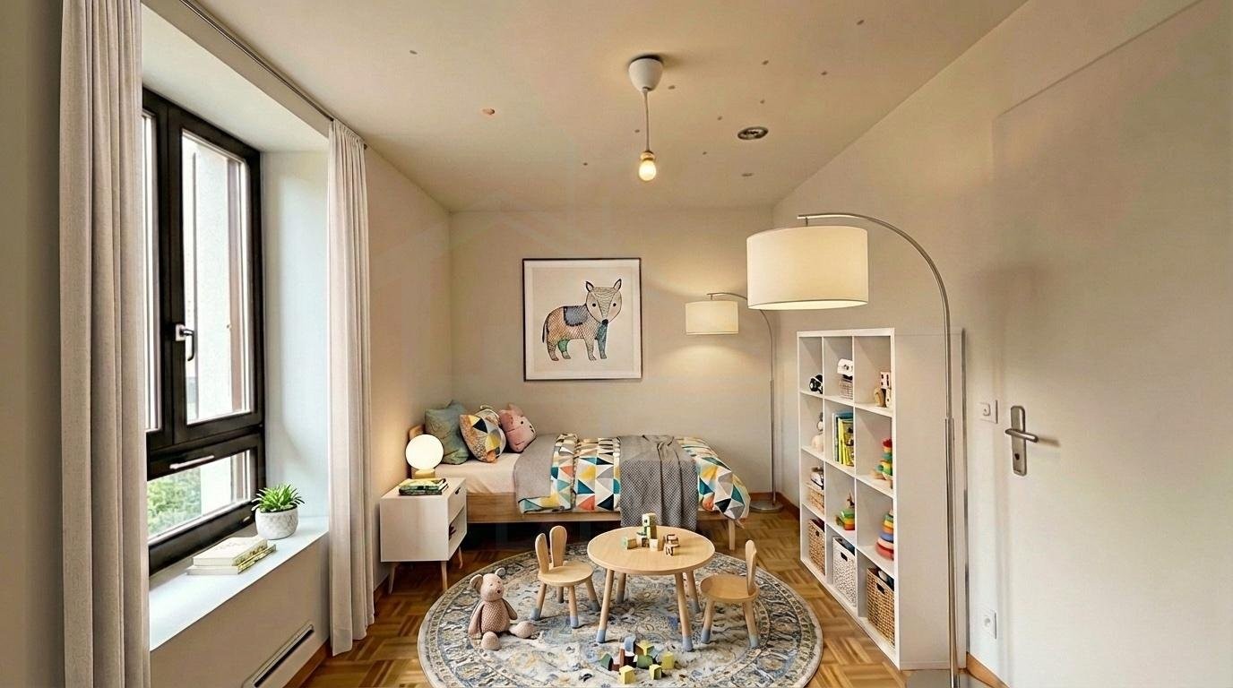 - À l'étage: deux chambres d'enfants avec des armoires encastrées et une salle de bains.