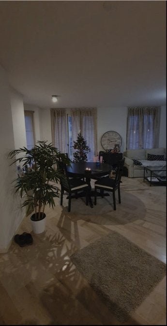- Salon avec coin repas : Spacieux et lumineux avec parquet en bois, offrant un espace de vie convivial.
