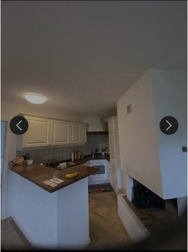 - Cuisine équipée : Moderne avec comptoir en bois, placards blancs, four et évier, agrémentée d'une cheminée pour une ambiance chaleureuse.