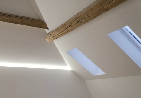 une grande pièce ouverte avec belle hauteur ( 5m) paquet en pointe de hongrie et charpente apparente