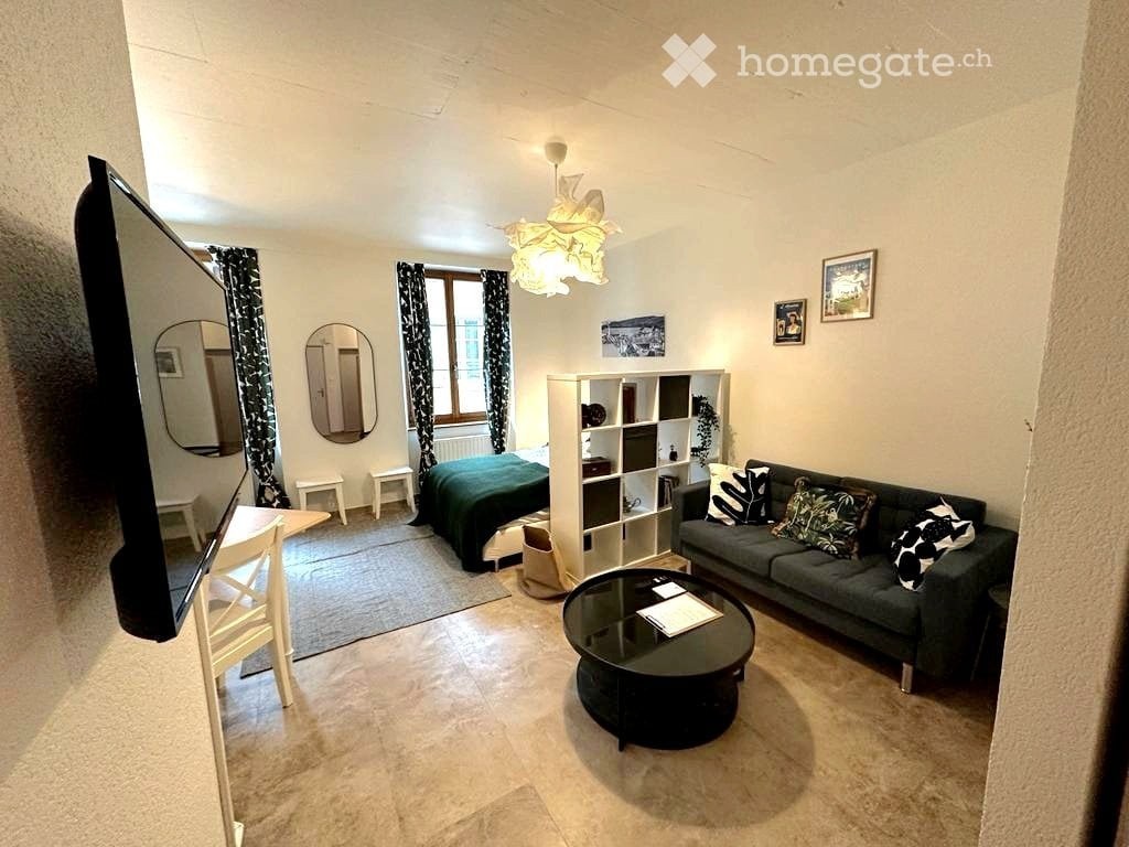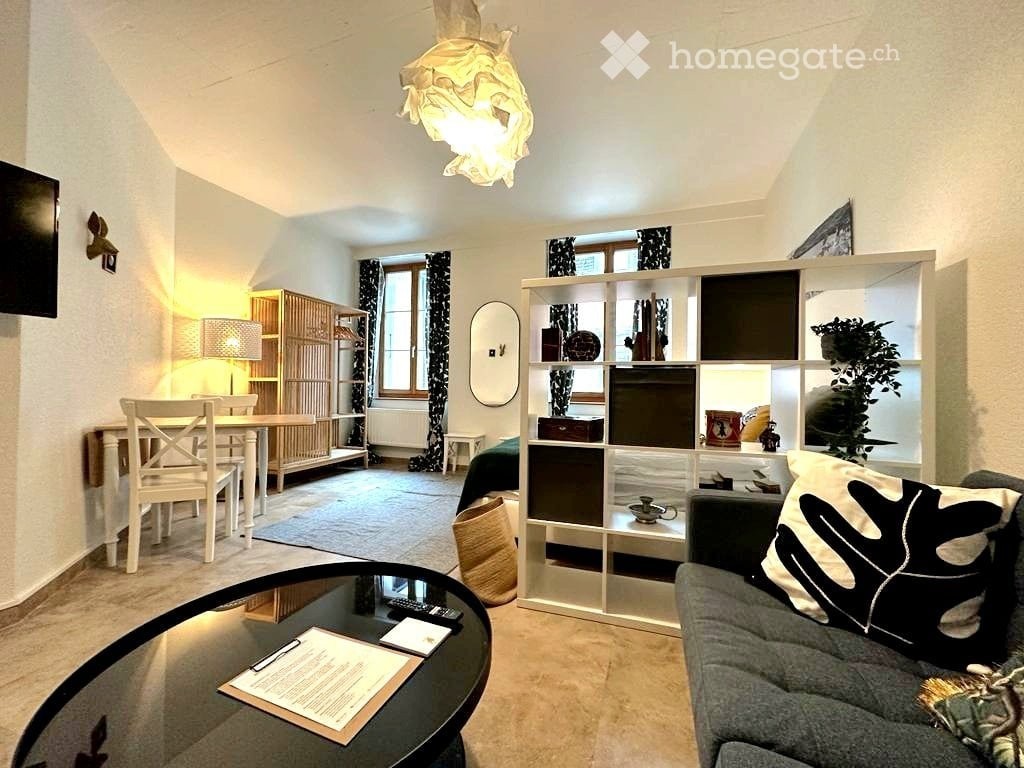 Charmant studio meublé au c?ur de Porrentruy. Le studio est composé d'une pièce à vivre avec un coin nuit ainsi que d'une cuisine séparée par un mur et d'une salle de bain attenante. Le tout est meublé et vous avez à disposition un salon avec Smart TV, un lit de 140 x 200 cm, une penderie, une cuisine toute équipée (microonde, machine à café, bouilloire, ustensiles de cuisine, etc ). La connexion wifi ainsi qu'un accès à une buanderie commune sont compris dans la location. Possibilité de louer le studio entre 1 mois et 1 année. Le studio se trouve au 2ème étage d'un immeuble sans ascenseur. Animaux admis (max. 1 chien / 1 chat). Prix par mois : CHF 790.00 cc, 3 mois de location au minimum via Anibis, pour une durée plus courte possibilité de le louer via Airbnb.