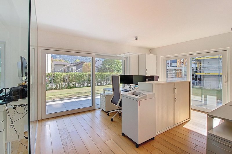 Recevez vos clients dans un cadre qui inspire immédiatement confiance et professionnalisme, tout en offrant à vos équipes un lieu de travail lumineux et apaisant. Avec 6 postes de travail déjà installés et une salle de conférence entièrement équipée, ces locaux permettent une mise en activité immédiate. Une terrasse et un jardin privatifs, rarissimes à Martigny, créent un espace idéal pour des réunions informelles ou des moments de détente. Possibilité de louer une place de parc extérieure couverte dans l'immeuble à CHF 100.-/mois.