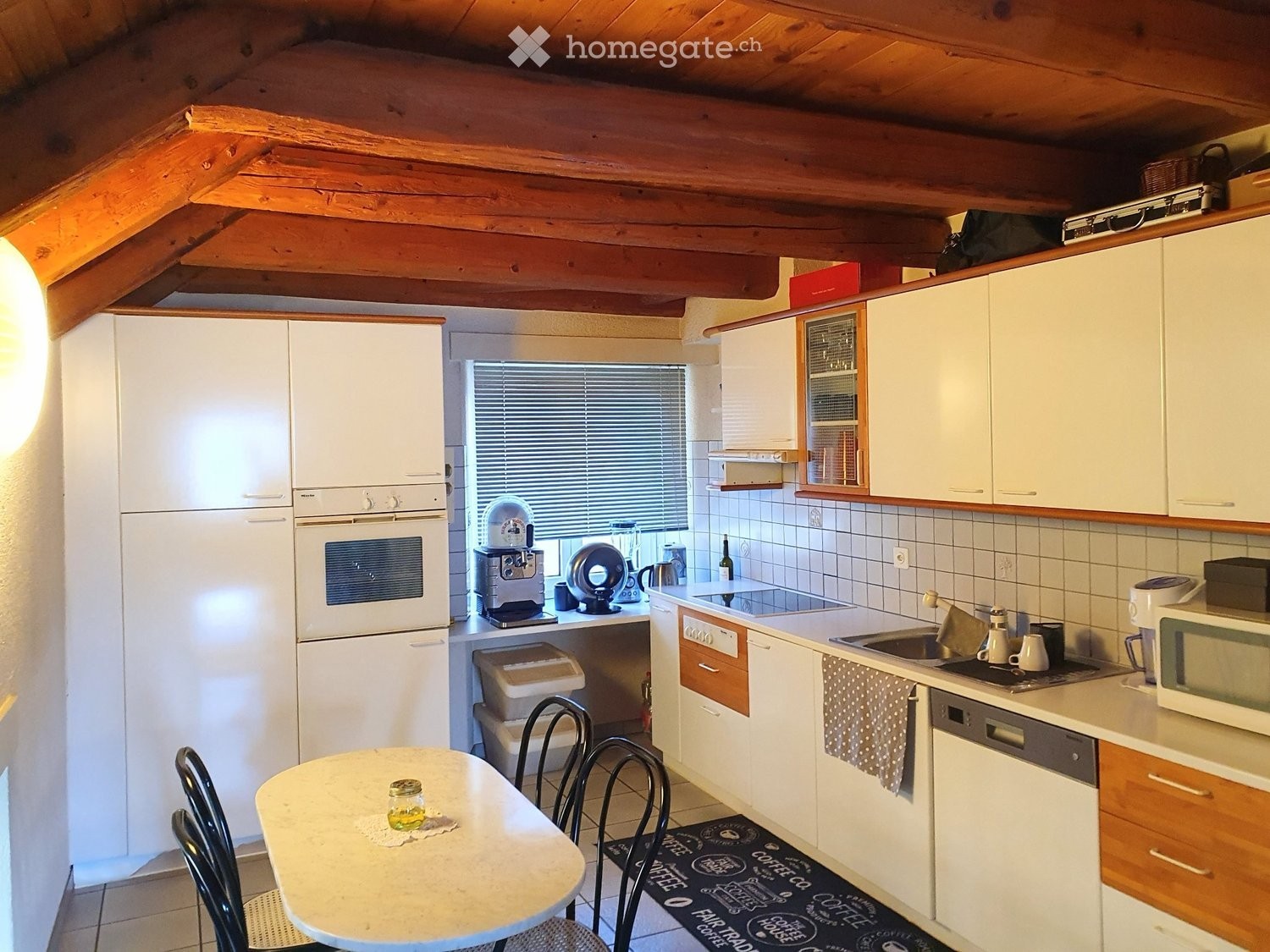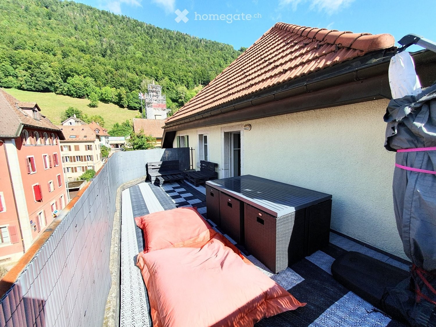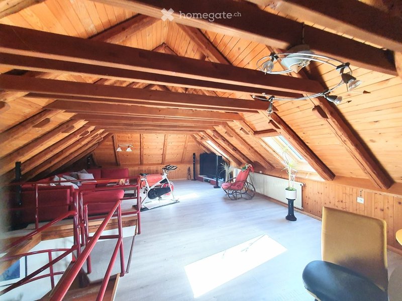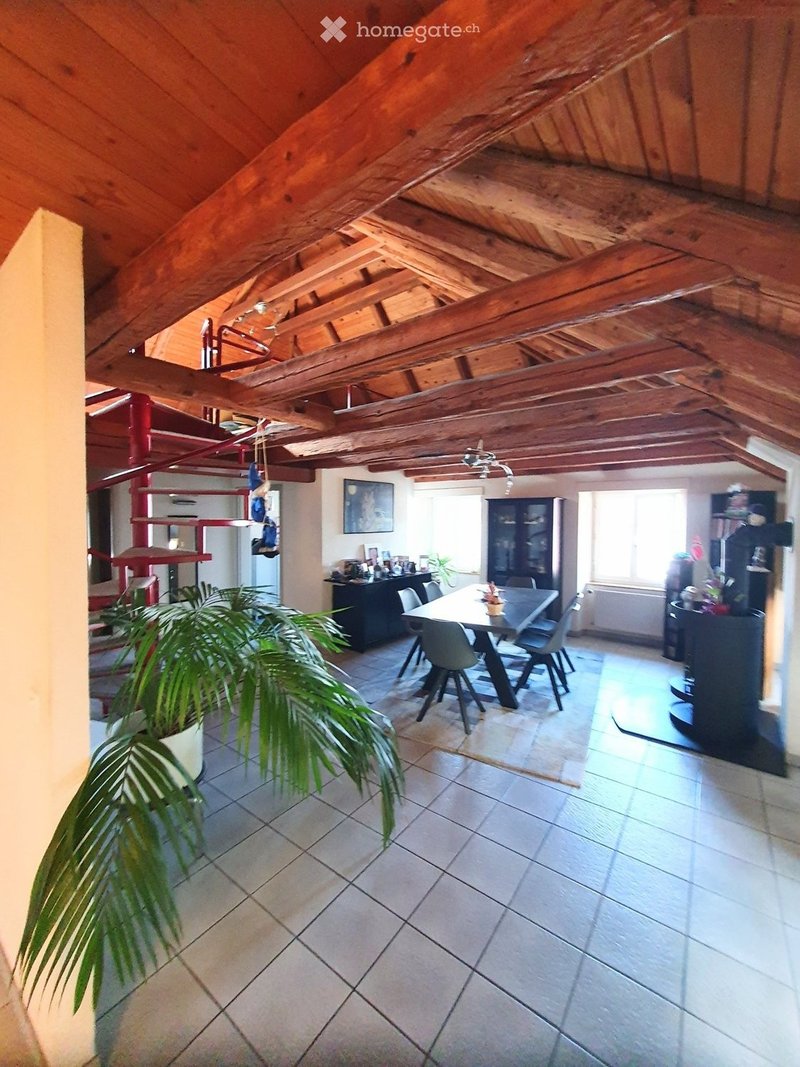 Magnifique charpente, beaucoup de cachet, poêle, 2 salles d'eau, terrasse, cave, garage + 100.-. Loyer frs 1'400.- charges 400.- Loyer total 1'800.-