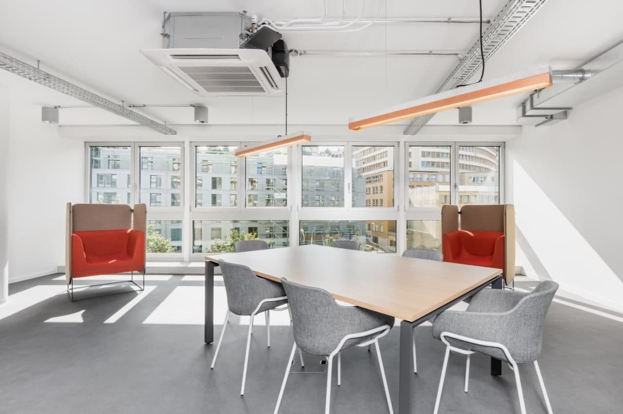 Cette offre comprend 8 m² de bureau privé et meublé avec 50 m² d'espaces partagés : salles de réunion, espace de coworking ouvert, salon, point café et zone de réception avec l'équipement de bureau.