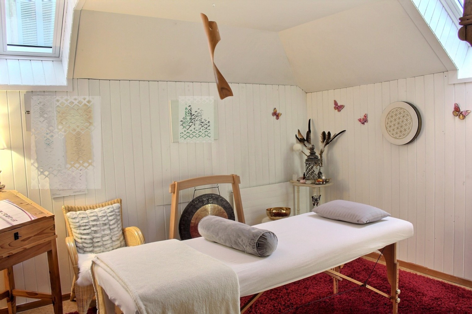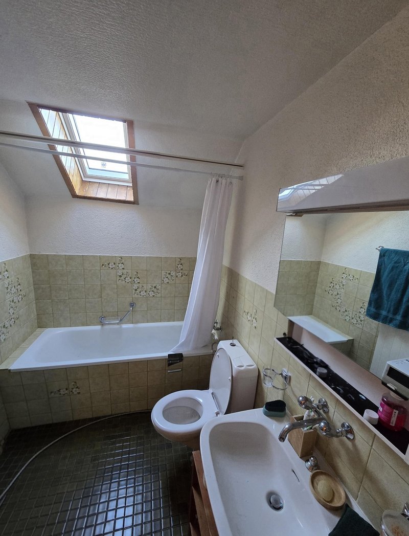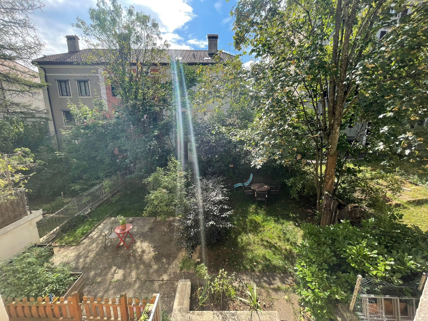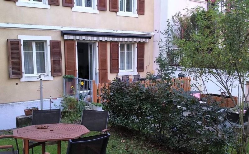 Jouissance de la moitié du jardin arboré de 100 m2, accès à un très grand galetas depuis l’appartement, buanderie partagée avec lave et sèche-linge (2 appartements), cave, chauffage à pellets