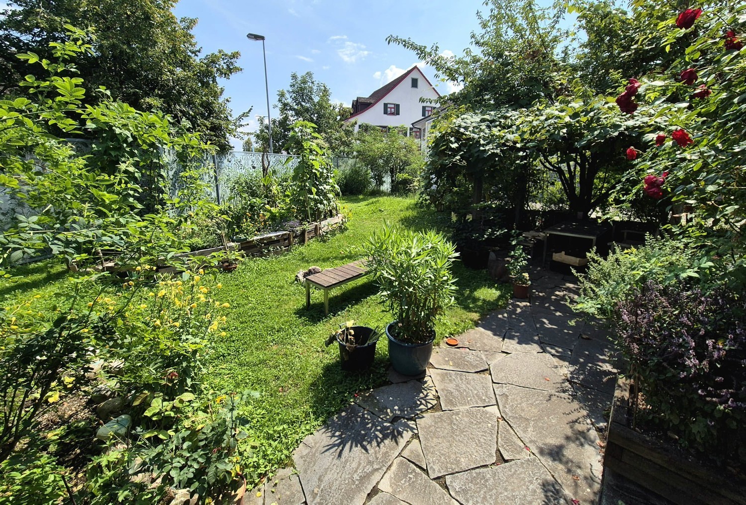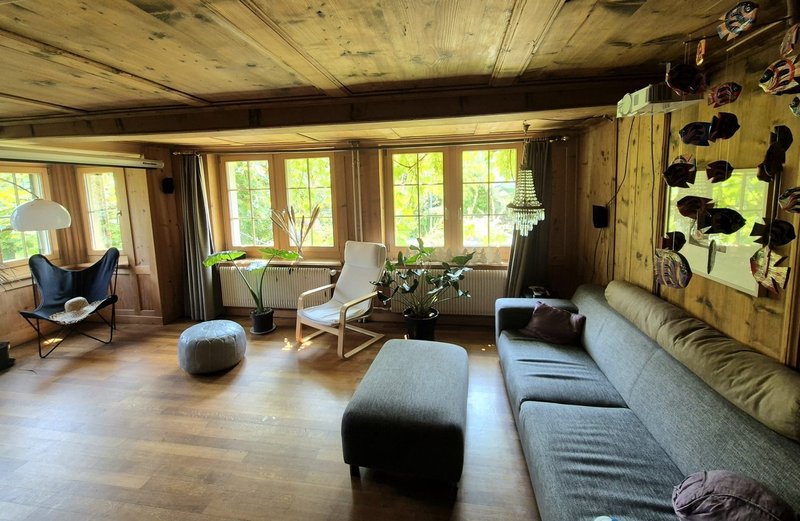 Zur gemeinsamen Benutzung stehen Wohnzimmer/Stube mit Kachelofen und Home-Cinema, Küche mit Abwaschmaschine, Keramik- und Holzherd, 2 Badezimmer, Garderobe, Garten mit Pergola und Cheminée zur Verfügung.