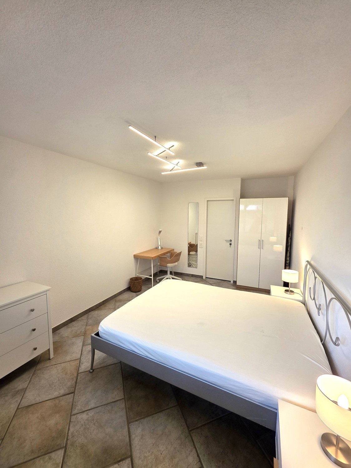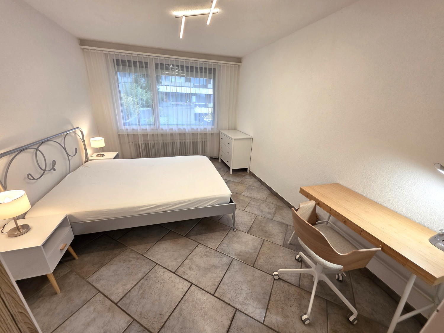 Möblierung: TV, grosser Schreibtisch, Esstisch, Sofa, Bett und genügend Stauraum