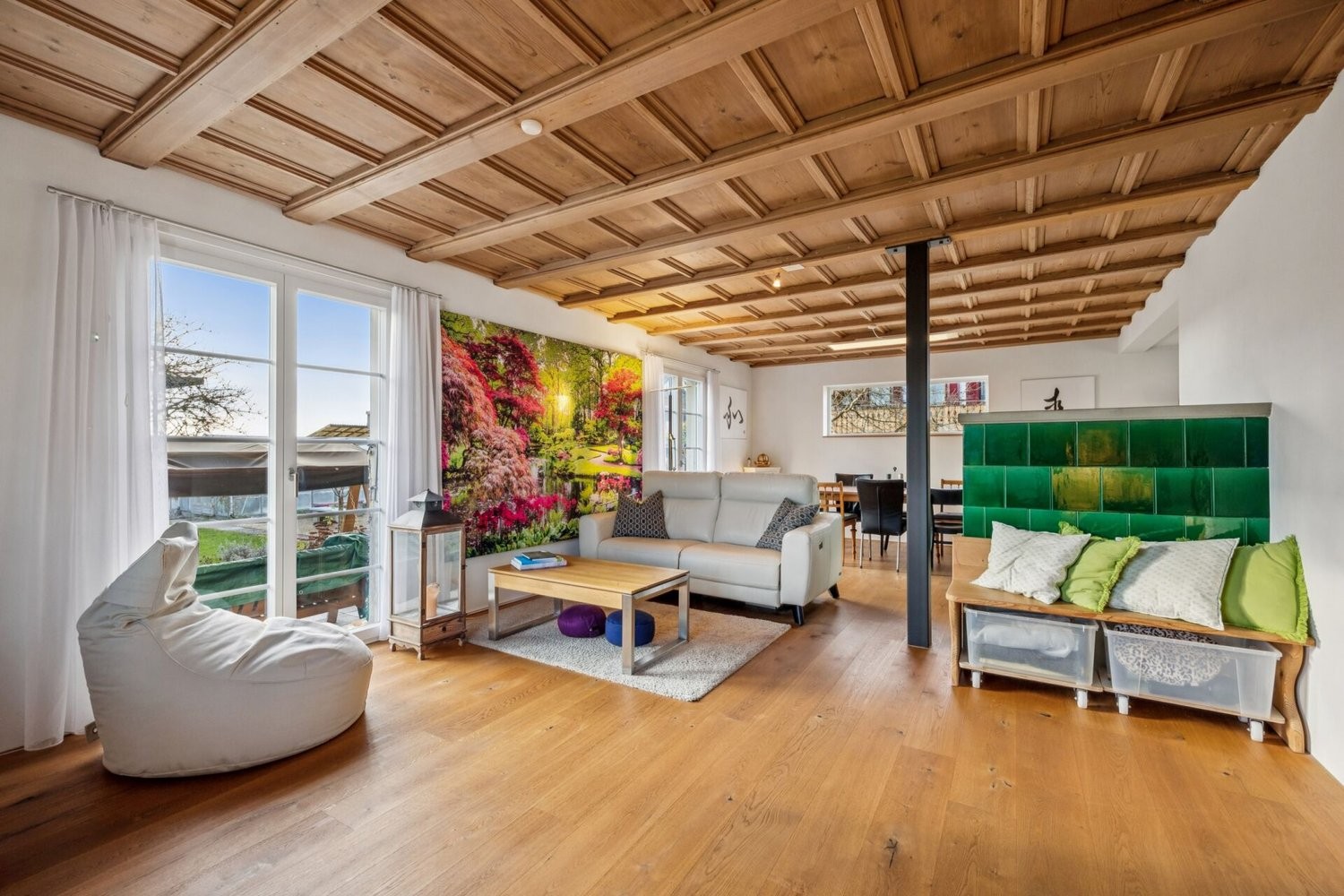 Heller Wohnbereich mit Holzbalkendecke und Parkett
