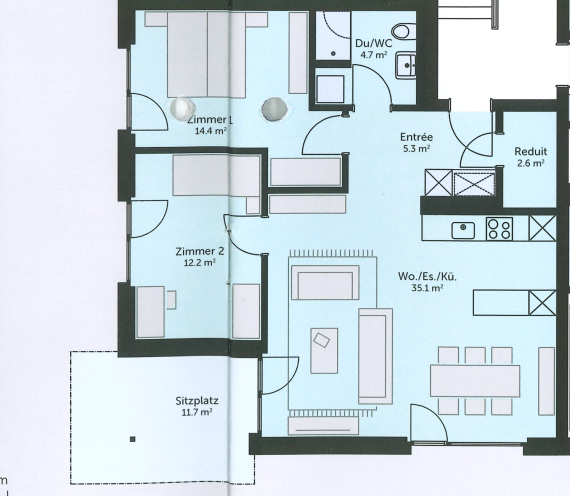 Wir vermieten nach Vereinbarung eine moderne 3.5-Zimmer-Wohnung im Erdgeschoss.