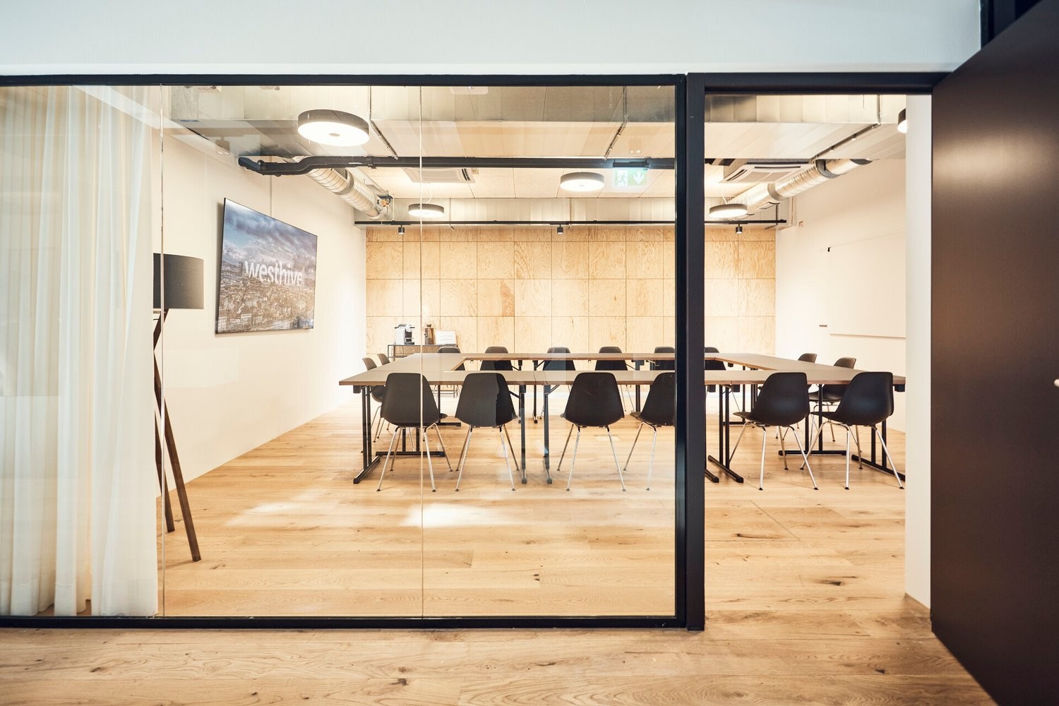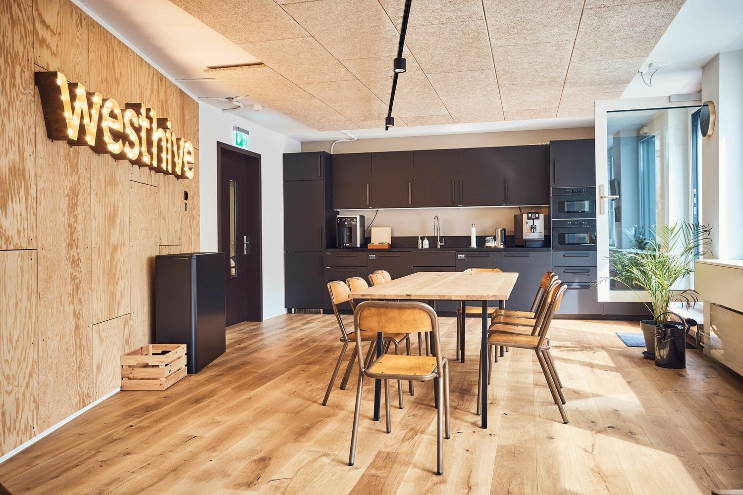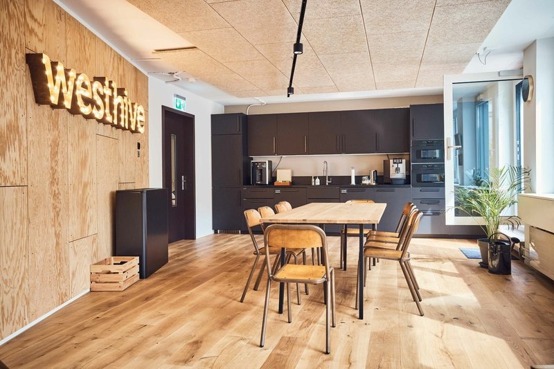Die Büros sind ausgestattet mit elektrisch höhenverstellbaren Schreibtischen , ergonomischen Bürostühlen sowie einem Whiteboard . Neben der Privatsphäre des eigenen Bürobereichs besteht Zugang zur gesamten Westhive-Infrastruktur auf einer Gemeinschaftsfläche von über 900 m² .