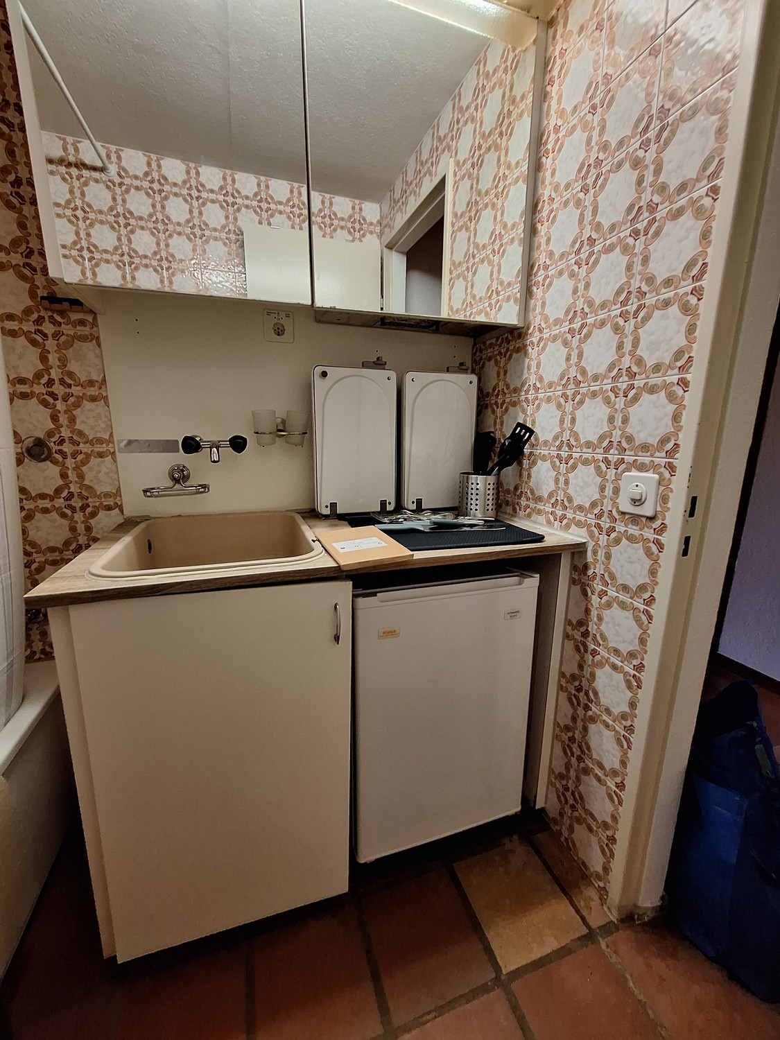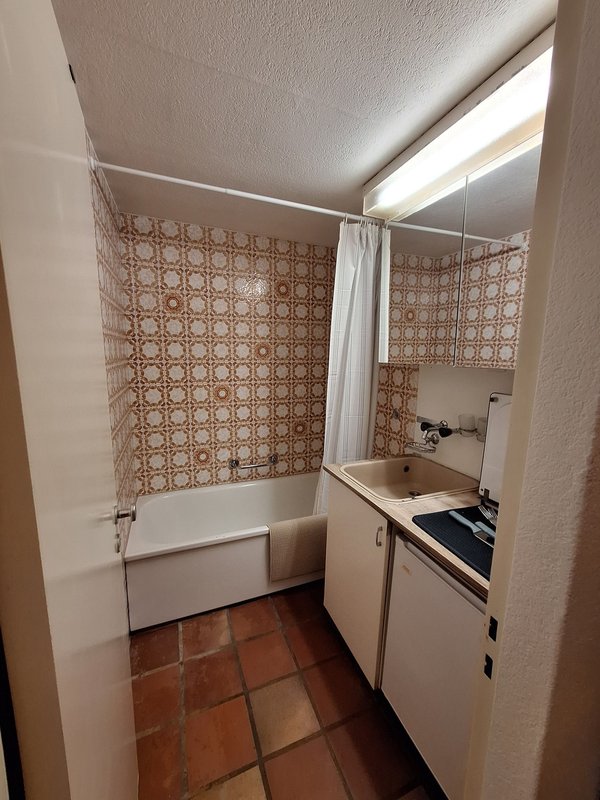 ca. 23-25qm, separates Bad/WC (Badewanne), Parkettboden und Kochgelegenheit.