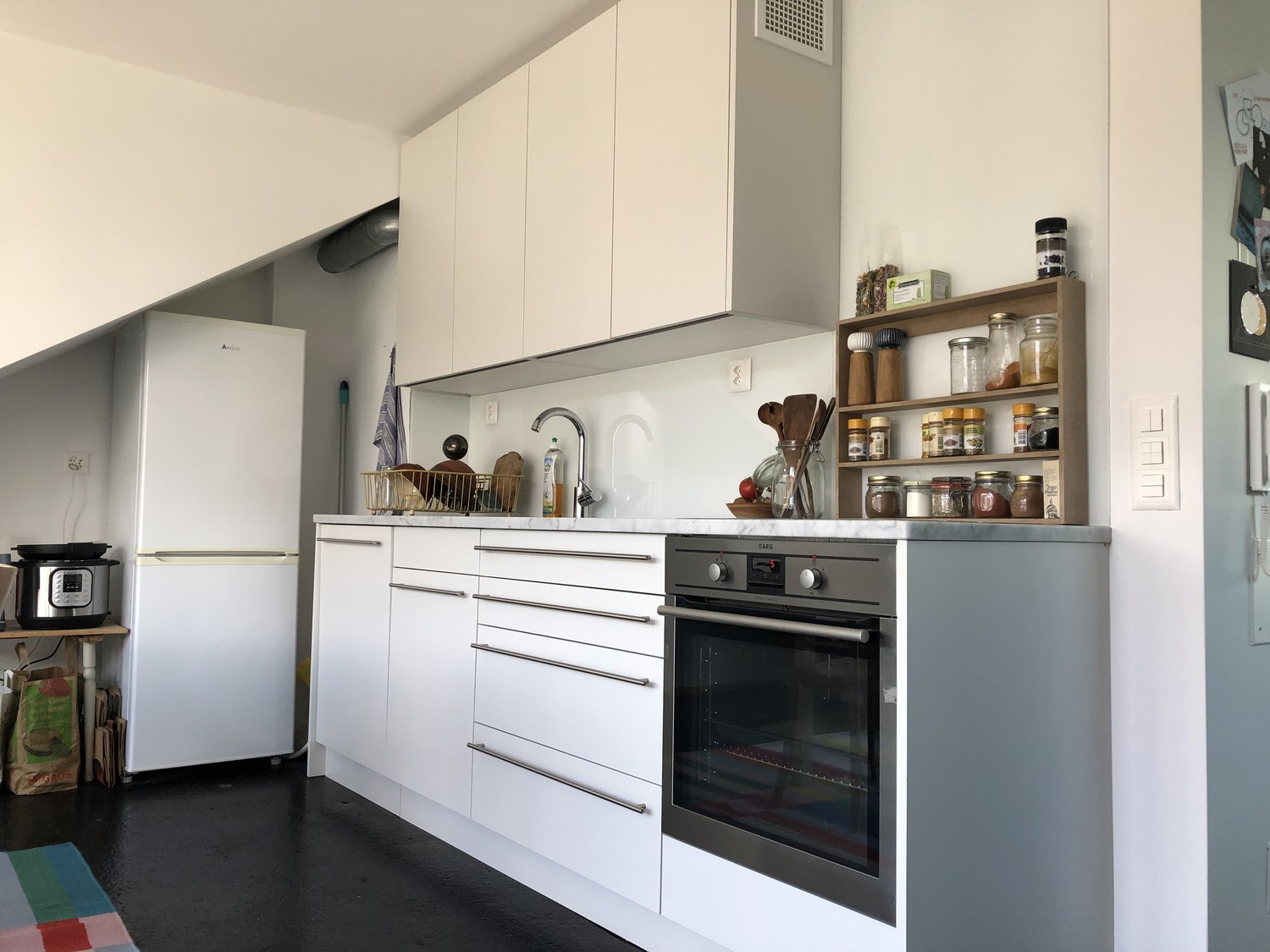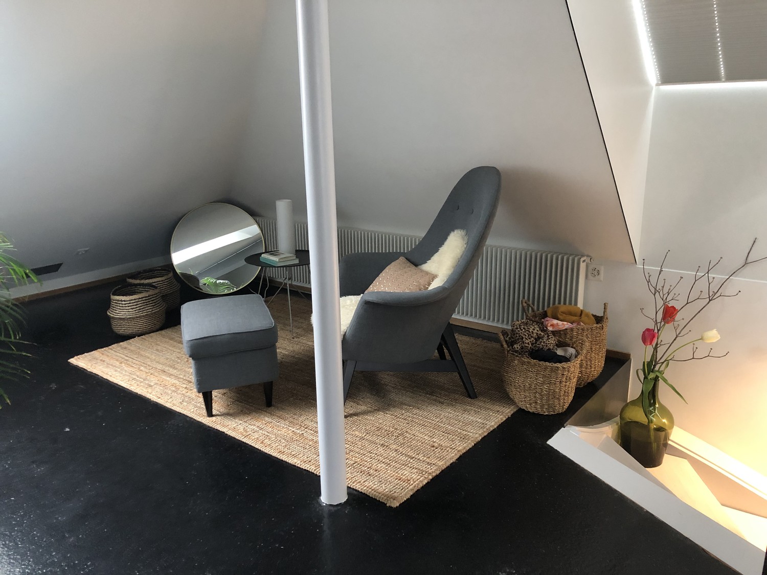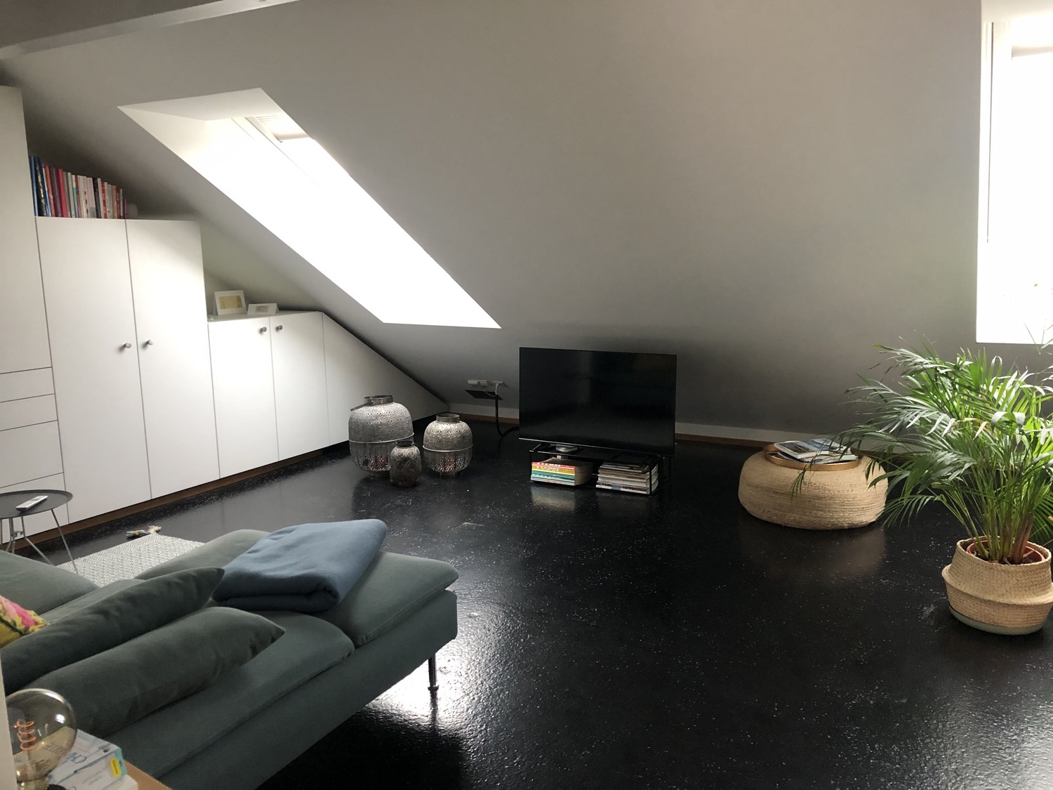 Glatte weisse Wände und Decken kombiniert mit dunkeln Gussasphalt-Böden bilden den Rahmen für Ihre Einrichtung.