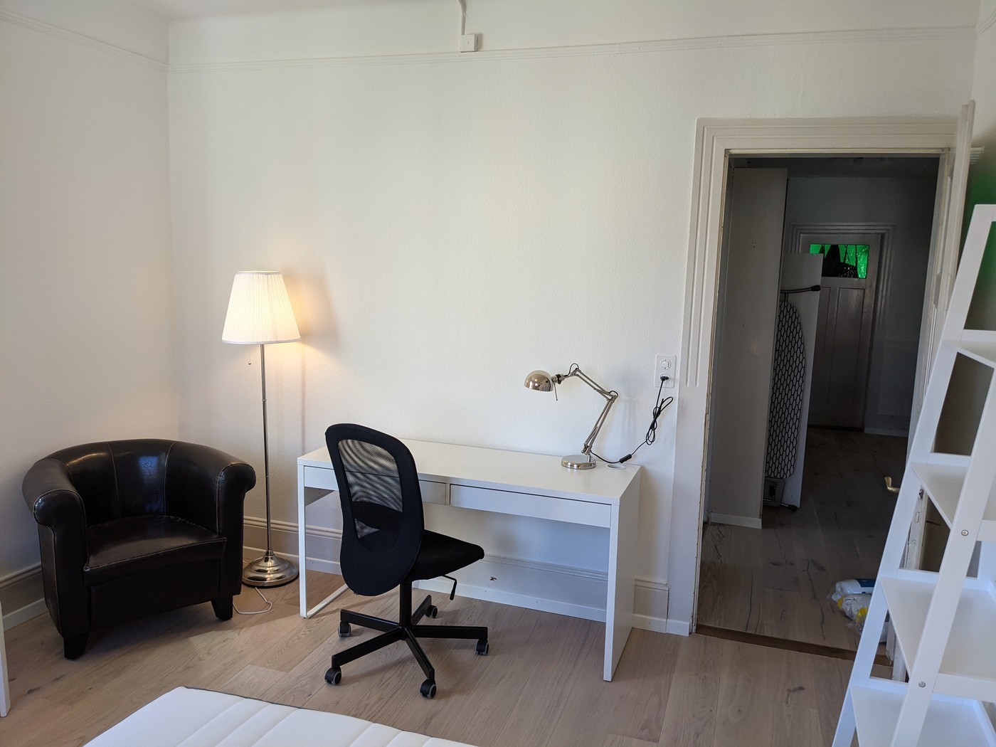 Your fully furnished room includes: wardrobe, large desk with chair, double bed with nightstand, sofa, and shelving units.
