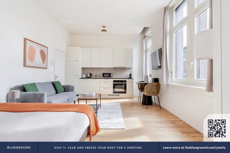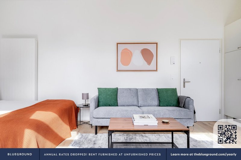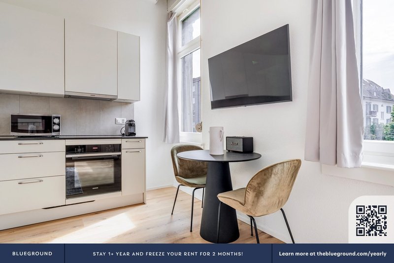 Wie bei jedem Blueground Wohnung finden Sie einen durchdacht gestalteten Raum mit schönen Möbeln. und eine voll ausgestattete Küche in diesem Studio Immobilie. Und dank unserer hochwertigen Matratzen können Sie sich entspannen, weil Sie sich immer wie zu Hause fühlen werden. Wenn Sie Lust auf etwas Spaß haben, können Sie die Zurich -Atmosphäre genießen oder sich die Unterhaltung mit dem kabellosen Premium-Lautsprecher oder dem Smart-TV direkt nach Hause holen. Diese Wohnung bietet auch Wäscherei in der Wohnung.