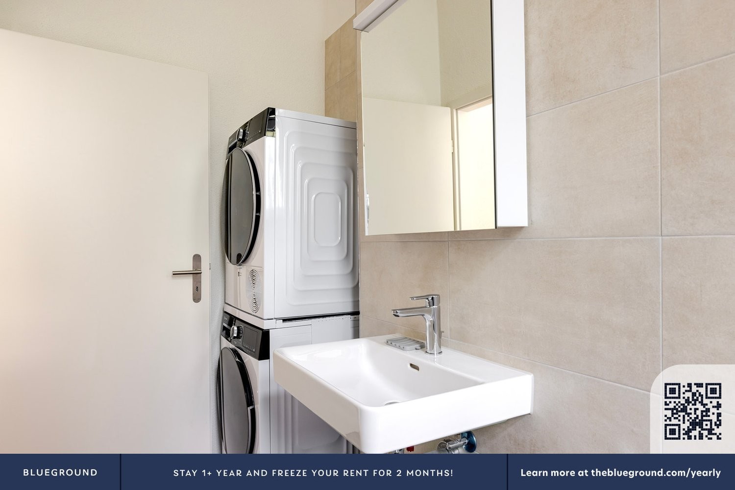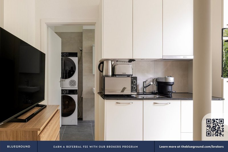 Wie bei jedem Blueground Wohnung finden Sie einen durchdacht gestalteten Raum mit schönen Möbeln. und eine voll ausgestattete Küche in diesem Studio Immobilie. Und dank unserer hochwertigen Matratzen können Sie sich entspannen, weil Sie sich immer wie zu Hause fühlen werden. Wenn Sie Lust auf etwas Spaß haben, können Sie die Zurich -Atmosphäre genießen oder sich die Unterhaltung mit dem kabellosen Premium-Lautsprecher oder dem Smart-TV direkt nach Hause holen. Diese Wohnung bietet auch Wäscherei in der Wohnung.