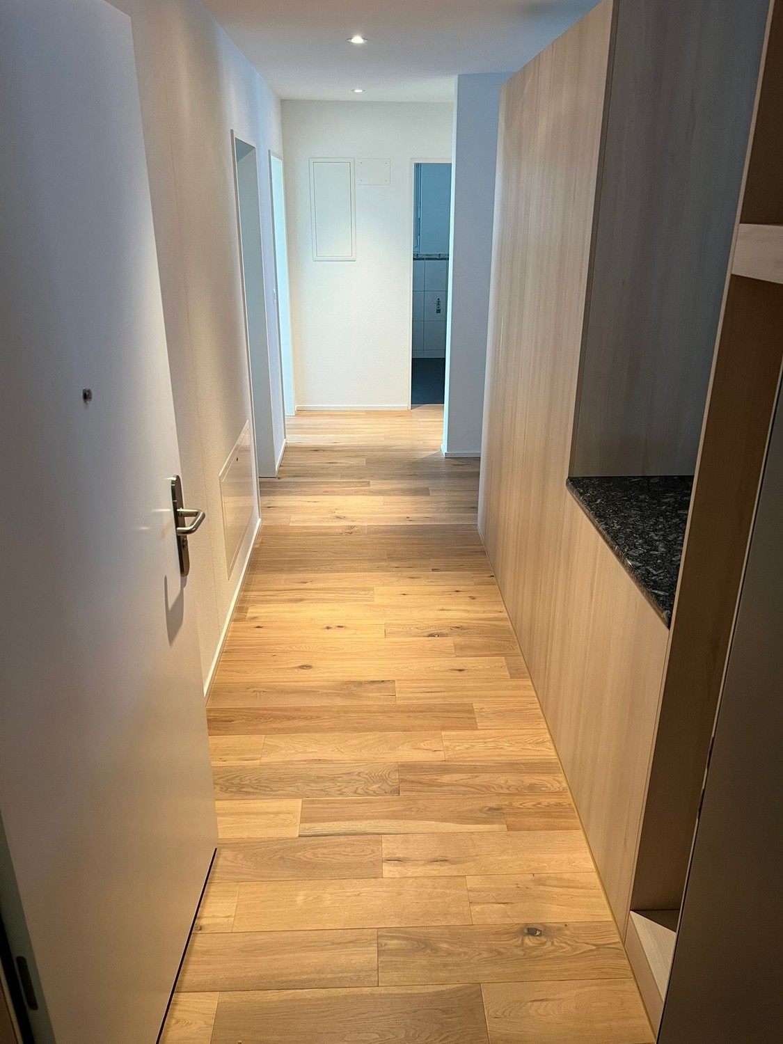 Stilvoller Eingangsbereich: Flur mit Holzboden und modernem Design, der zu den verschiedenen Räumen führt