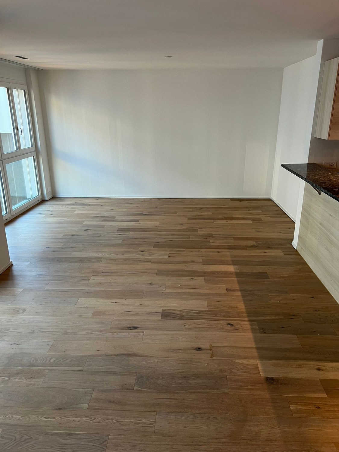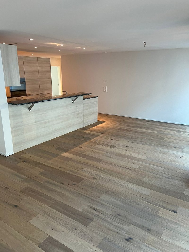 Offener Wohn- und Küchenbereich: Grosszügiger Raum mit edlen Holzböden, weissen Wänden und grossen Glasfenstern, die viel Tageslicht hereinlassen
