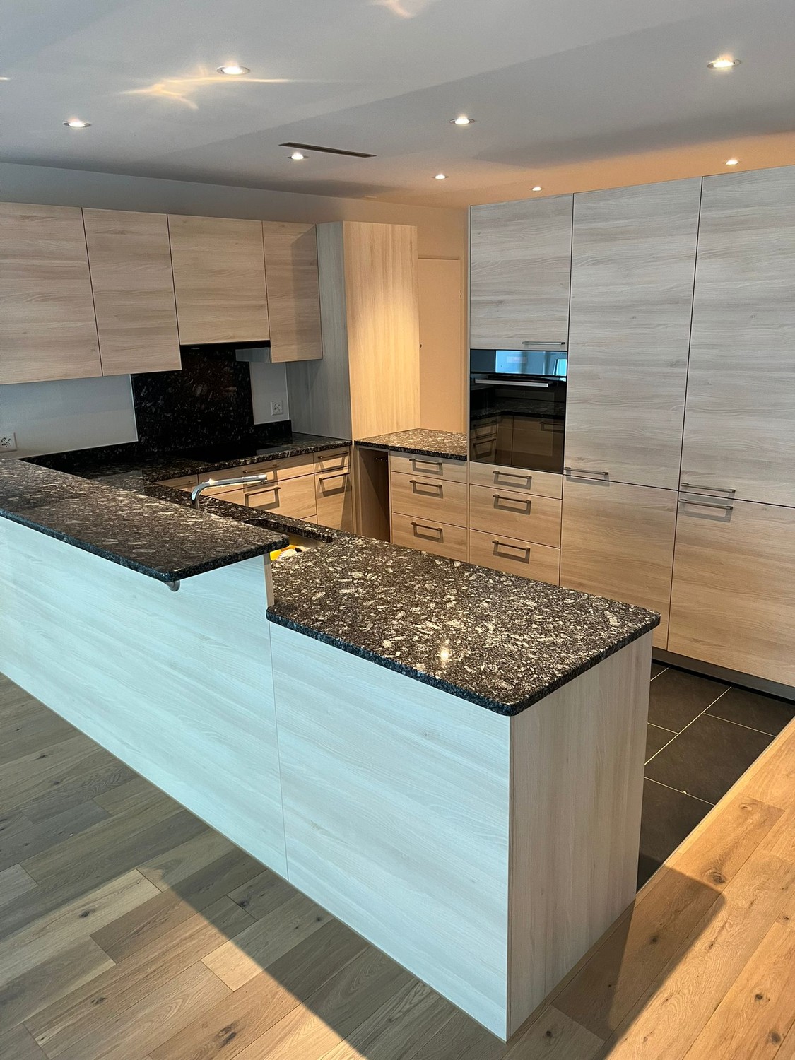 Moderne Küche: Hochwertig ausgestattet mit Holzschränken, Granit-Arbeitsplatten, integrierten Geräten, Marmor-Rückwand und einer praktischen Kücheninsel