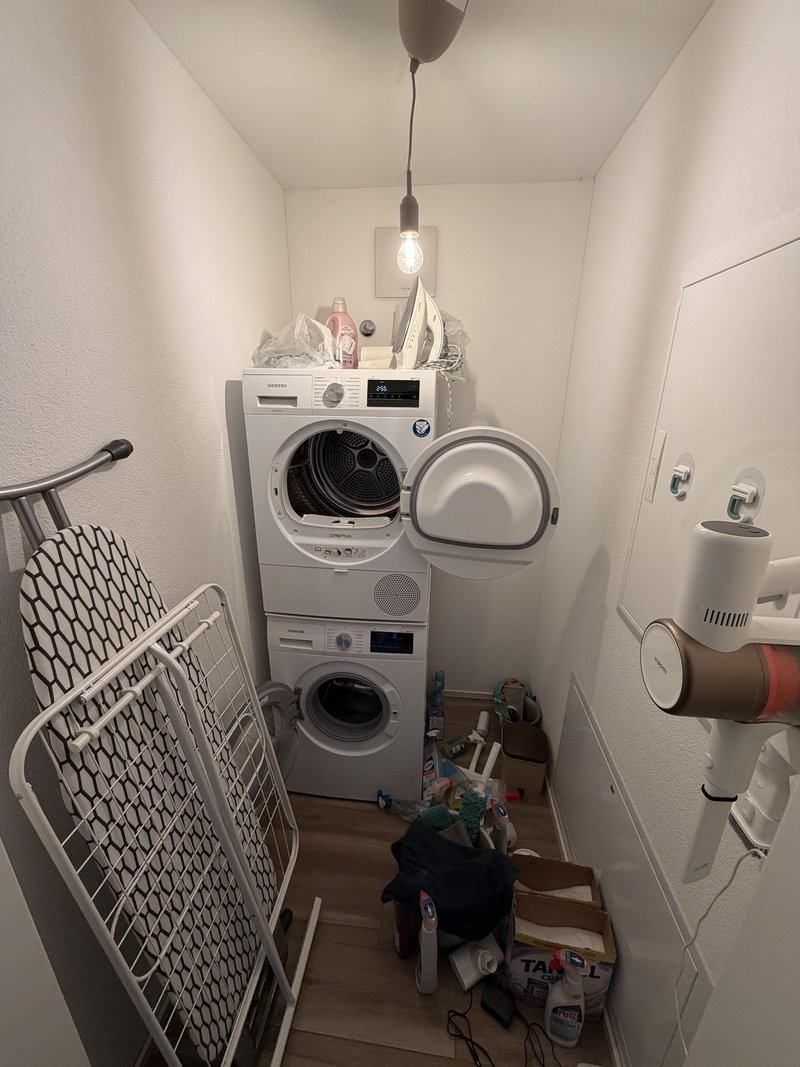 Die restliche Wohnung ist voll ausgestattet: moderne Küche mit Backofen und Geschirrspüler, Wohnzimmer, Essbereich mit Balkon, eigene Waschmaschine und Tumbler sowie ein zweites Badezimmer. Du teilst die Wohnung mit zwei Young Professionals (w/m).