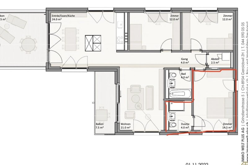 Per 1. April 2026 vermieten wir ein helles, möbliertes Zimmer (ca. 19 m²) mit eigenem Duschbad in einer modernen 4.5-Zimmer-Wohnung an der Schärenmoosstrasse in Zürich. Das Zimmer verfügt über grosse Fenster mit viel Tageslicht.