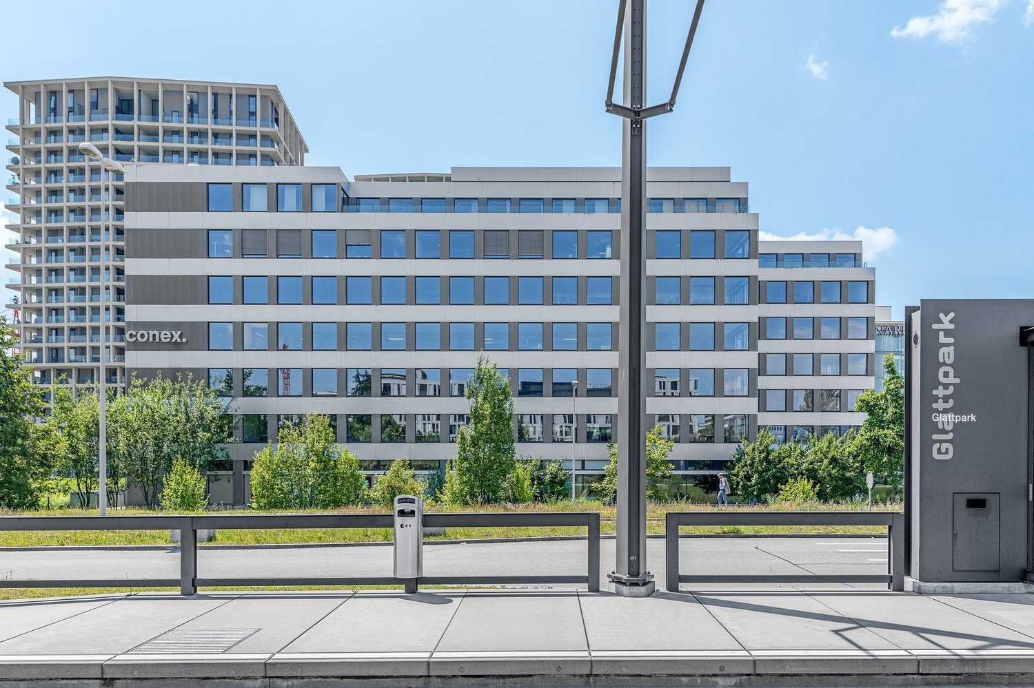 Tramstation Glattpark unmittelbar beim Gebäude (Linien 10, 11, 12) mit direktem Anschluss an die Bahnhöfe Oerlikon und Glattbrugg sowie die Region Wallisellen/Dübendorf