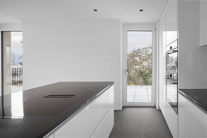 Über die Treppe oder bequem über den Lift gelangen Sie in die obere Etage der Wohnung. Hier öffnet sich der Wohnraum für das gesellige Leben: Die offene Küche mit Kochinsel und praktischem Reduit erfüllt höchste Ansprüche und bietet den idealen Rahmen für gemeinsame Abende oder ein Glas Wein zu zweit beim Sonnenuntergang. Die Verbindung zum Wohnraum, die grossen Fensterfronten mit unverbaubarer Panorama-Weitsicht und die eindrucksvolle Terrasse, die von zwei Seiten zugänglich ist, schaffen ein Gefühl von Weite und Freiheit.