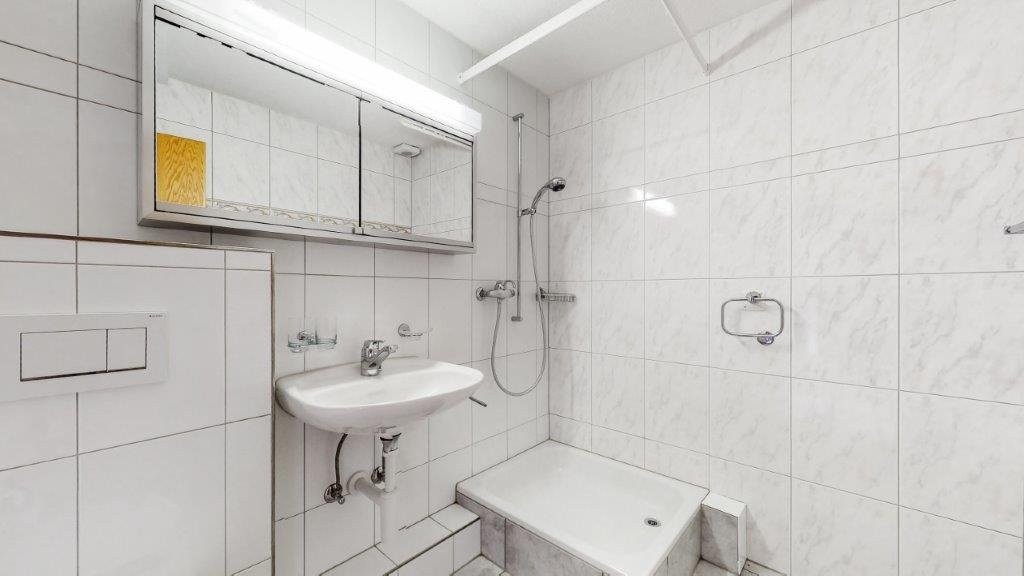Nasszelle mit Dusche: Das Badezimmer verfügt über eine zeitgemässe Dusche, die für Komfort und Funktionalität sorgt.