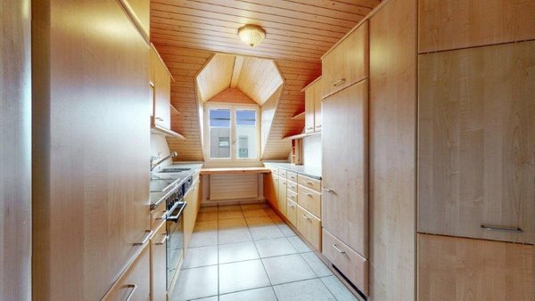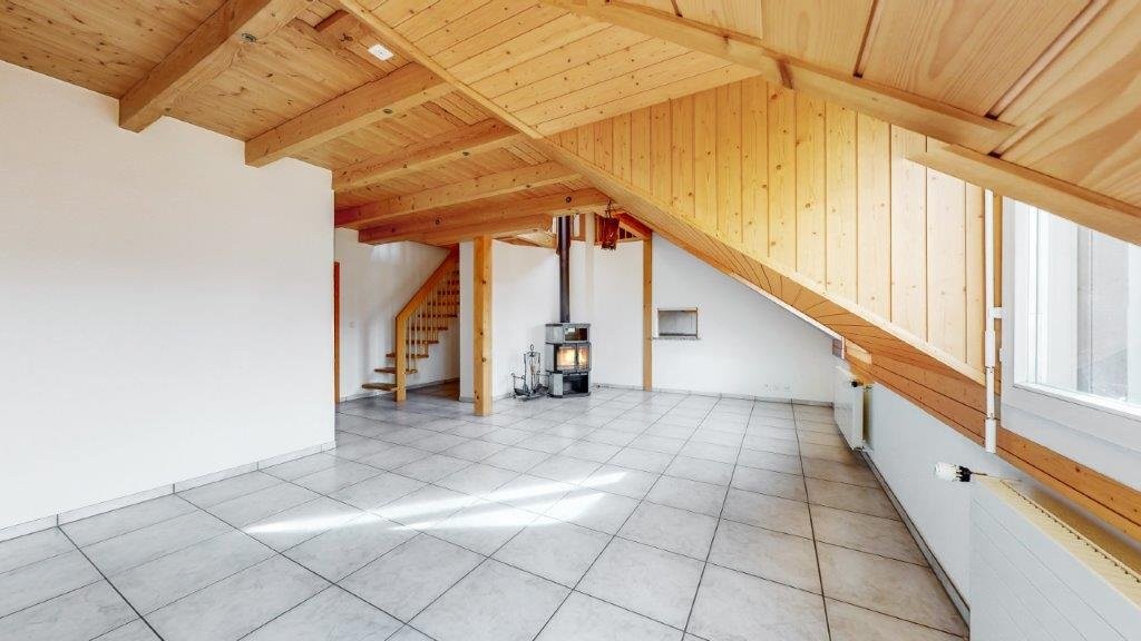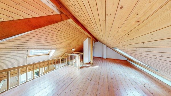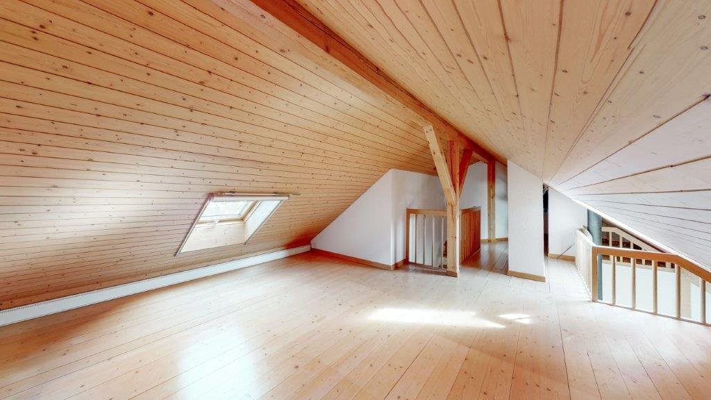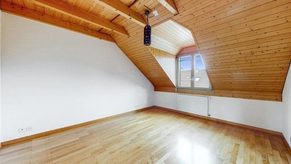 Helles Schlafzimmer: Das Schlafzimmer überzeugt mit einem durchdachten Schnitt und Platz für Ihre Einrichtungsideen – der ideale Rückzugsort mit Blick Bantiger. Oder Sie richten Ihre Schlafgelegenheit in der schönen Galerie ein, wo Sie jederzeit den Überblick behalten. Von aussen beschattete Dachfenster und installierte Fliegengitter lassen alle Möglichkeiten offen.