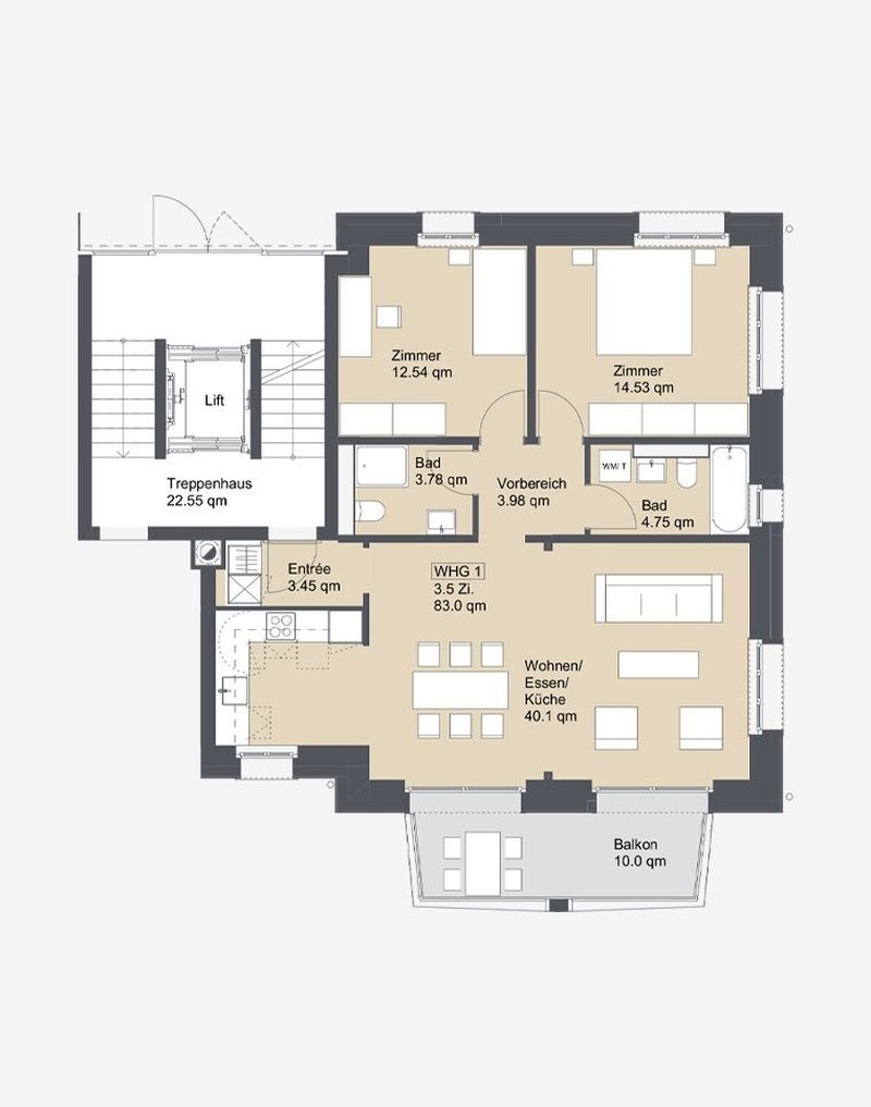 Fischgrat-Parkett aus Eiche. Dazu passt die schlichte Küche mit ihren eleganten Natursteinflächen, sowie, je nach Grundriss, einer Kochinsel.
