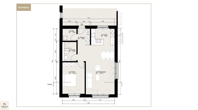 Entdecken Sie diese hochwertige 2.5 Zimmer Neubauwohnung im Erdgeschoss eines modernen weissen Mehrfamilienhauses im Schlossfeld in 8447 Dachsen ZH. Mit 71.8 m² Wohnfläche, grosszügiger Raumhöhe von rund 2.7 m und privatem Aussenbereich vereint diese Wohnung zeitgemässe Architektur, Nachhaltigkeit und hohen Wohnkomfort.