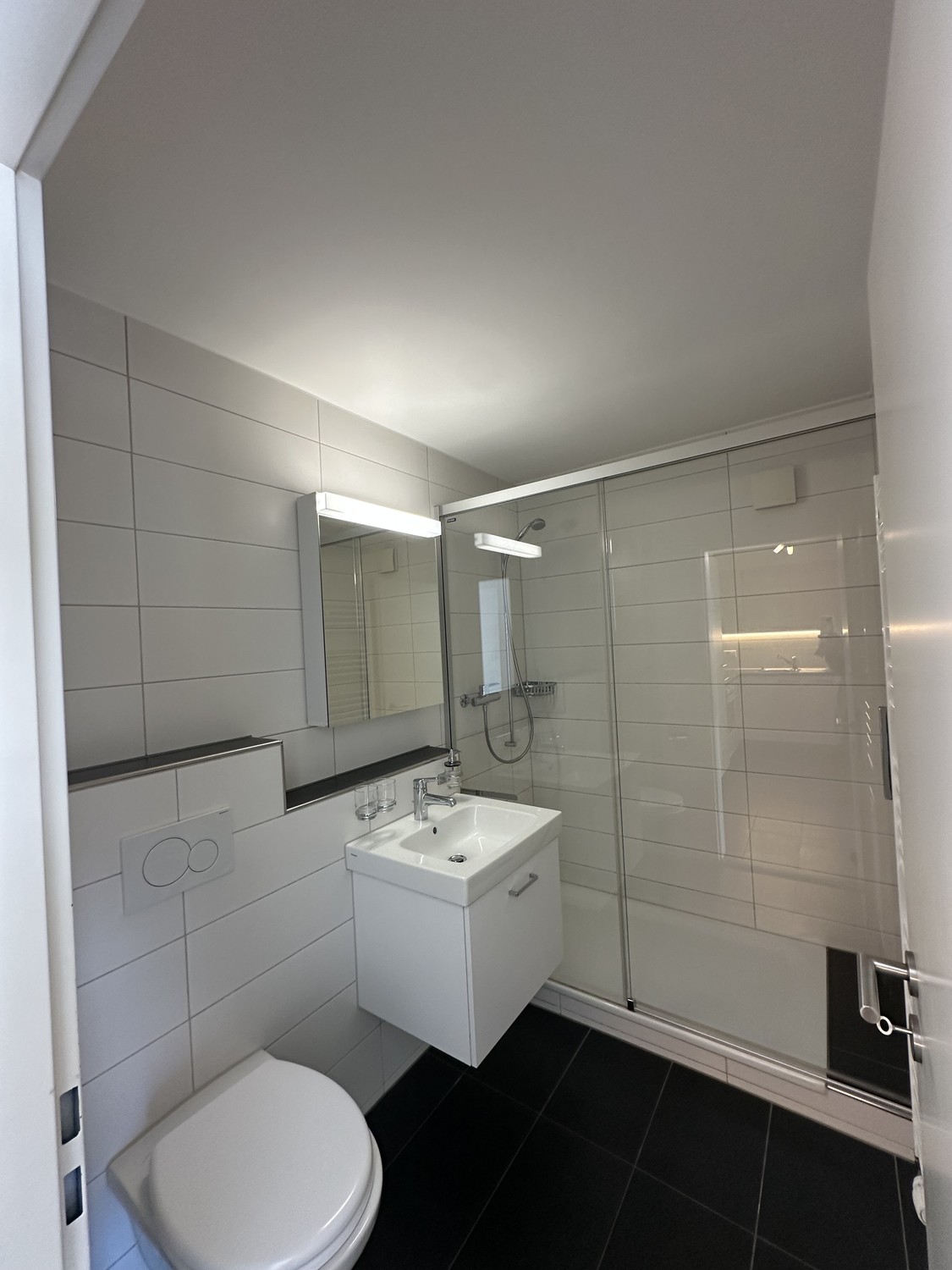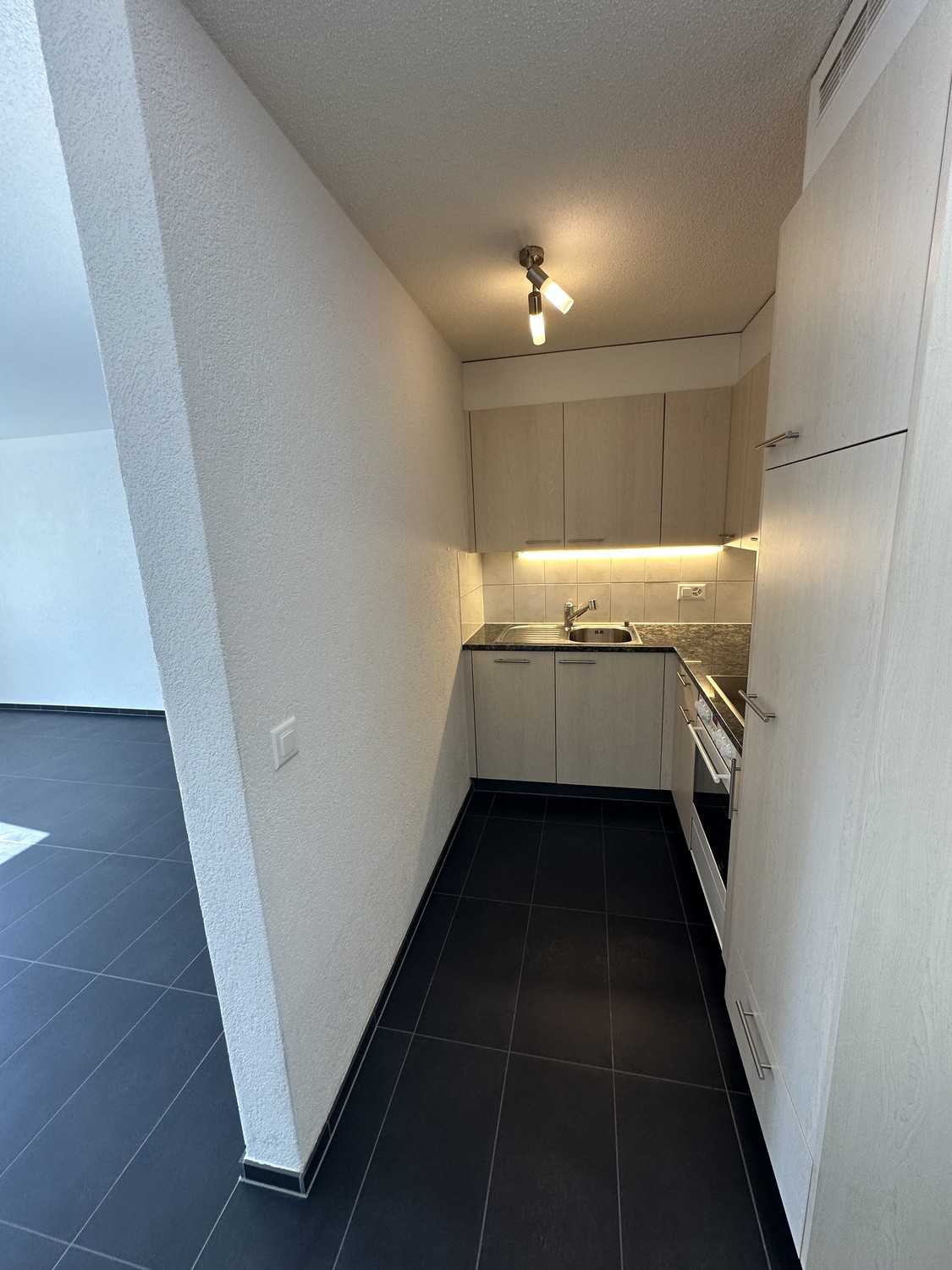 - Küche, Korridor, Wohnzimmer und Badezimmer sind mit dunklen Plattenböden verlegt