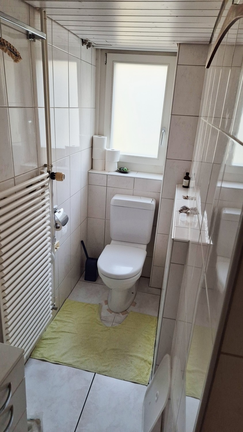 Komfortables Badezimmer: Mit Badewanne und Dusche, Fliesenwänden sowie eigener Waschmaschine