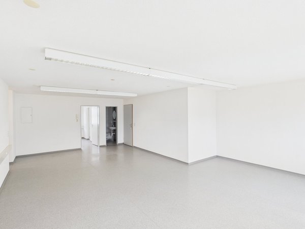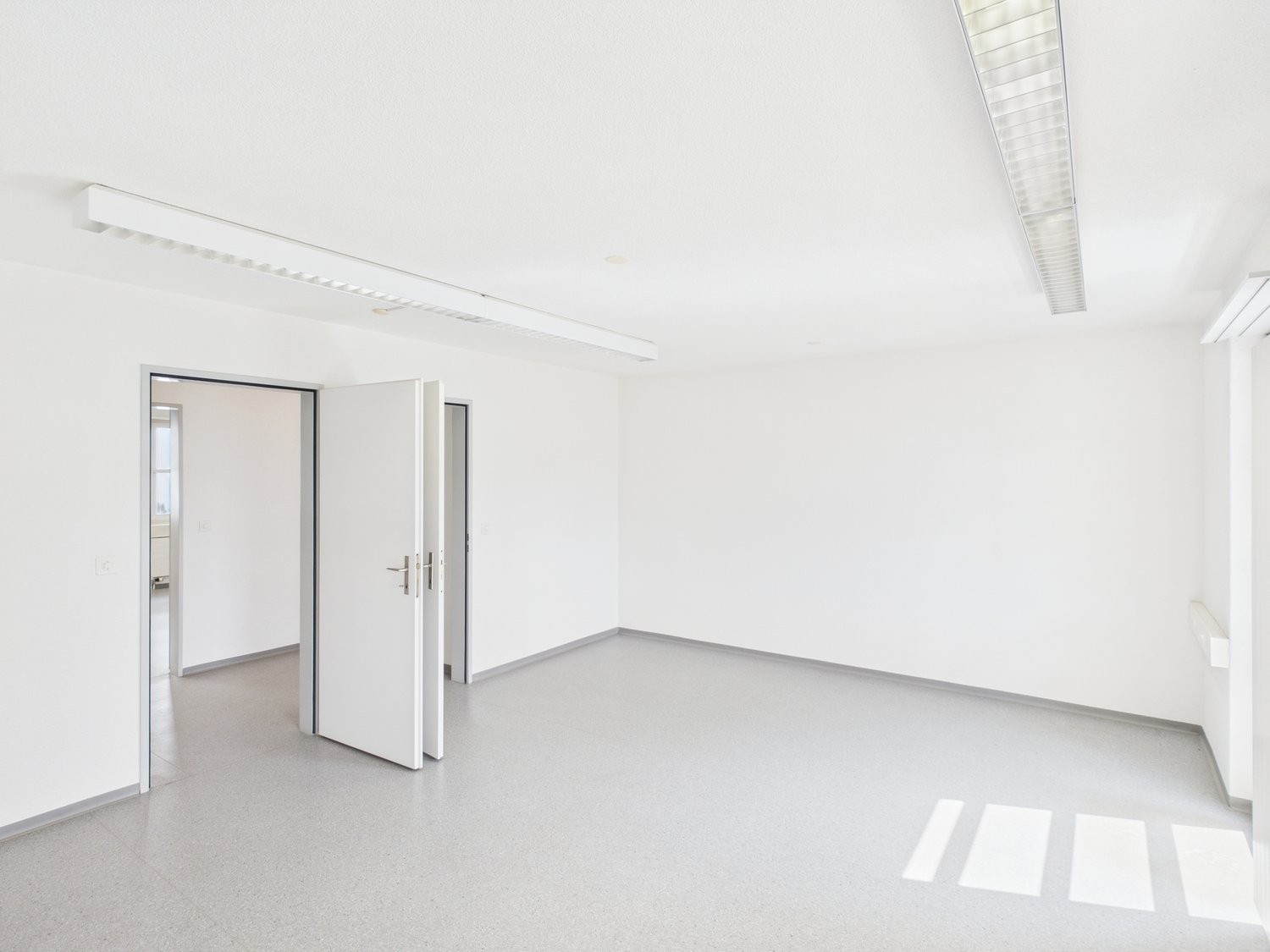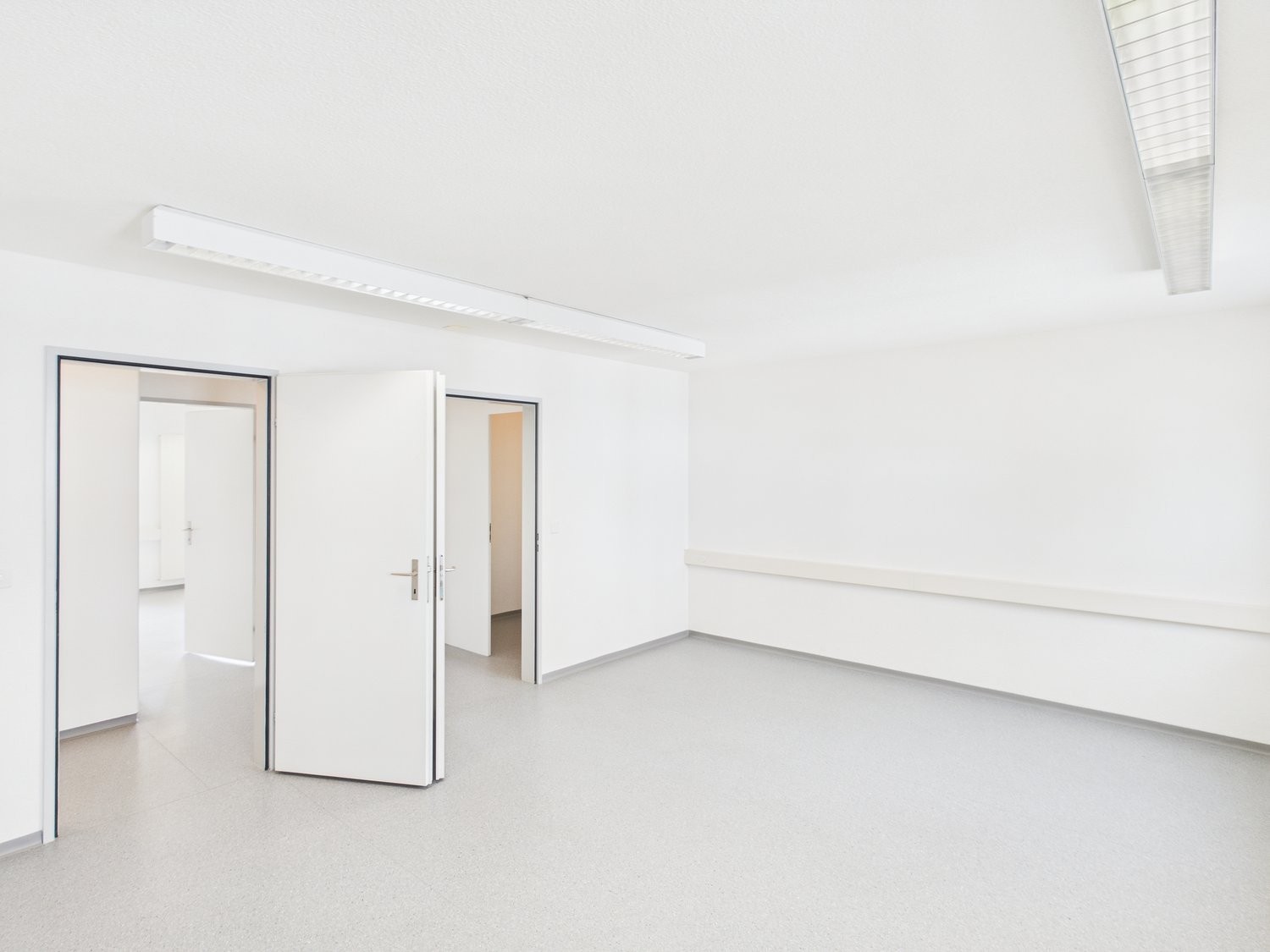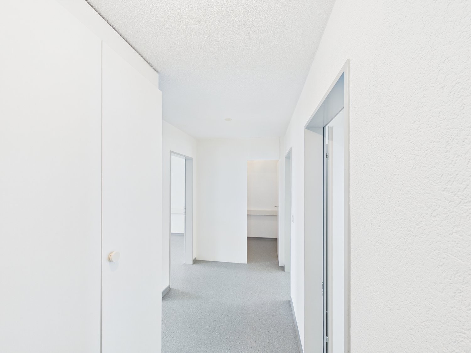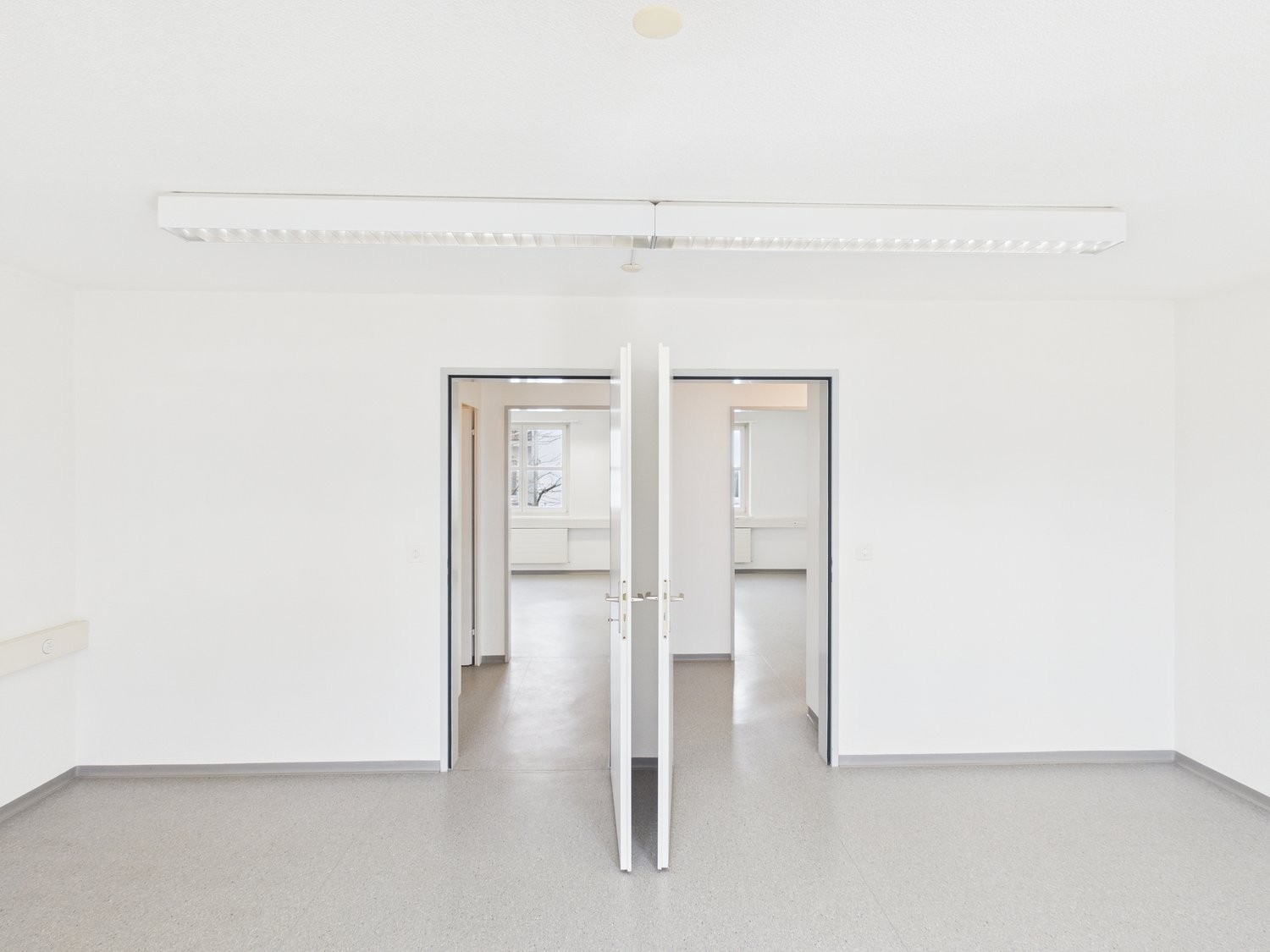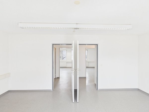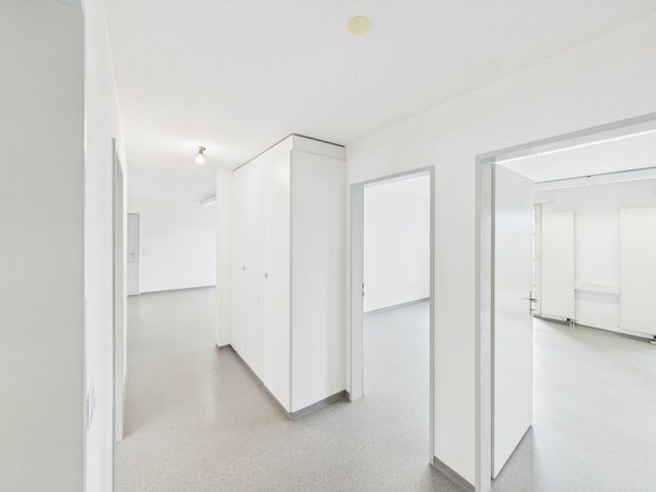 Grosszügige Raumaufteilung: Mehrere offene und separate Räume mit weissen Wänden und modernen Böden