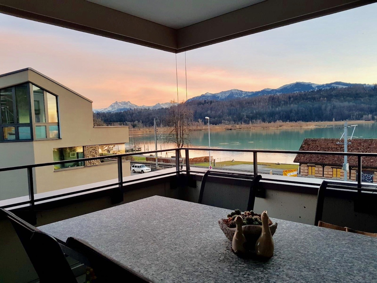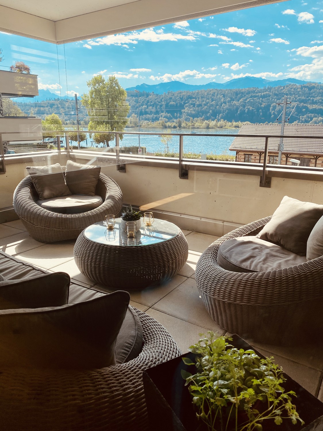 Der südseitige Balkon bietet eine unverbaubare, traumhafte Aussicht auf den Zürichsee sowie auf die umliegende Berglandschaft – hier geniessen Sie Sonne und Panorama gleichermassen.